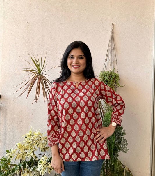 Modal Silk Ajrakh Saree with Zari - Brick Red