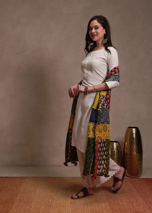 Ajrakh Applique & Kantha Embroidered Dupatta ~ White, Blue & Yellow