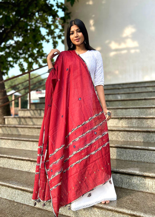Ajrakh Applique & Kantha Embroidered Dupatta ~ Deep Red with Kantha Work