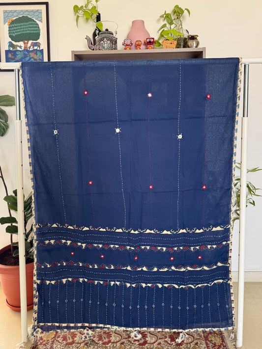 Ajrakh Applique & Kantha Embroidered Dupatta ~ Navy Blue with Kantha Work