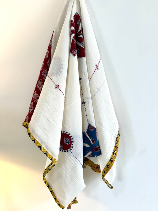 Ajrakh Applique & Kantha Embroidered Dupatta ~ White, Blue & Yellow