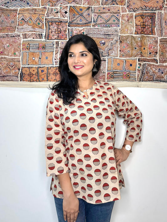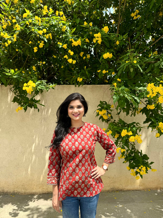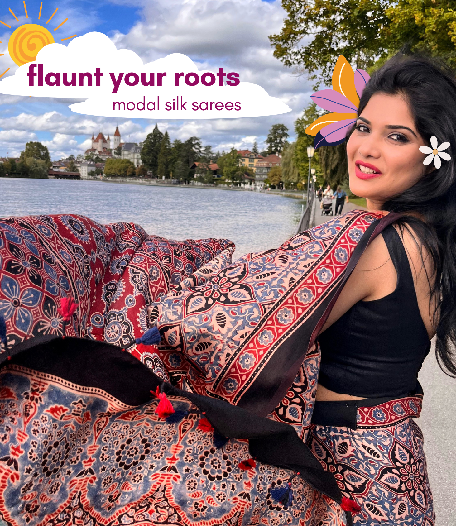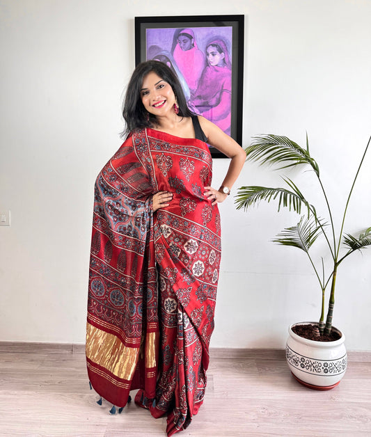 Modal Silk Ajrakh Saree with Zari - Brick Red