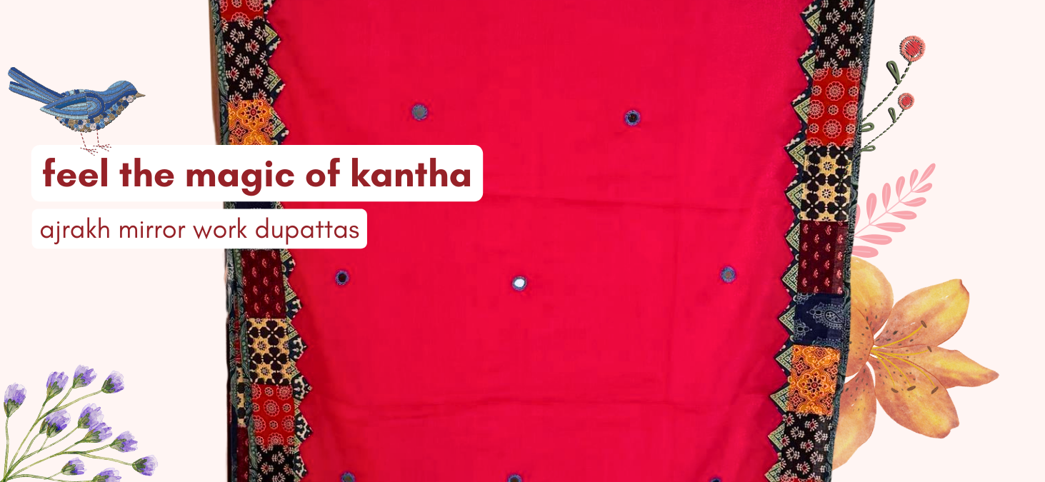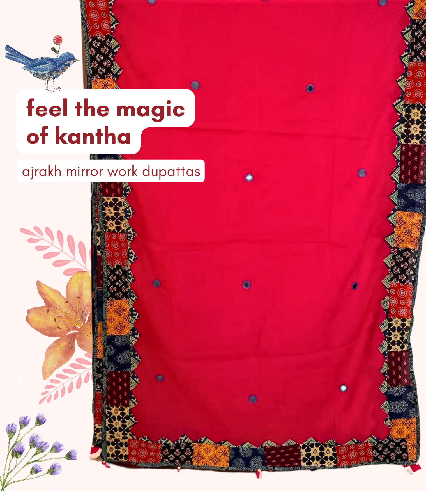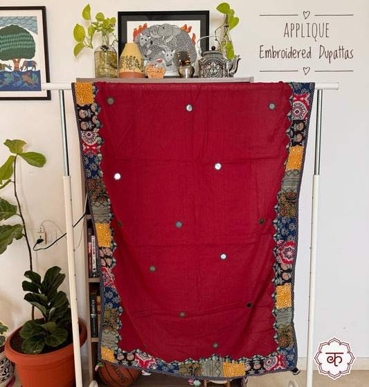 Ajrakh Applique & Kantha Embroidered Dupatta ~ Deep Red