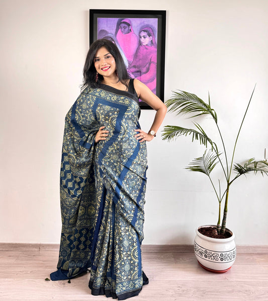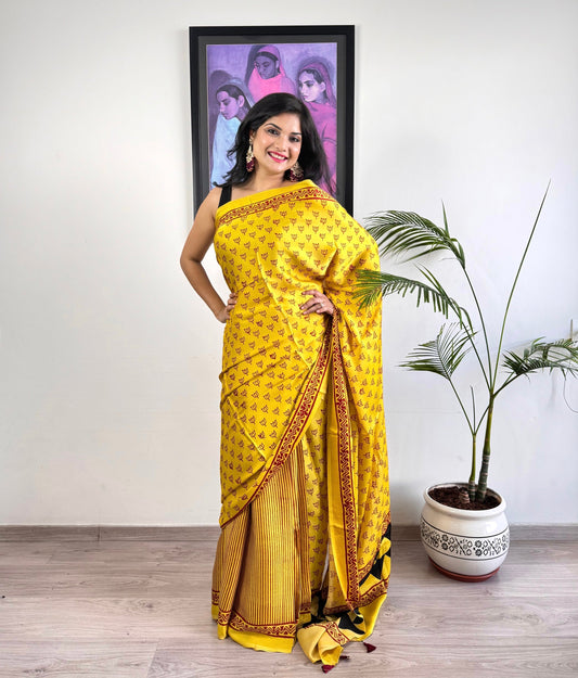 Modal Silk Ajrakh Saree - Turmeric yellow