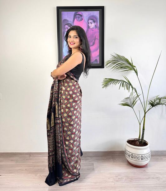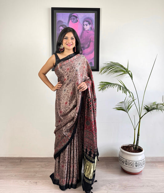 Modal Silk Ajrakh Saree with Zari - Beige Brown