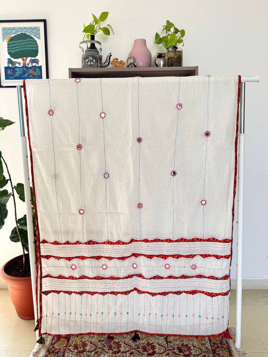 Ajrakh Applique & Kantha Embroidered Dupatta ~ White, Blue with Pink mirrors