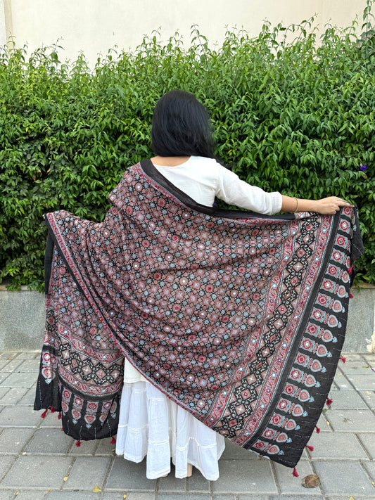 Modal Silk Ajrakh Dupatta ~ Black Worli Art Motif w/ Zari