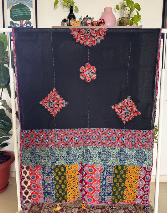 Ajrakh Applique & Kantha Embroidered Dupatta ~ Black & Cream