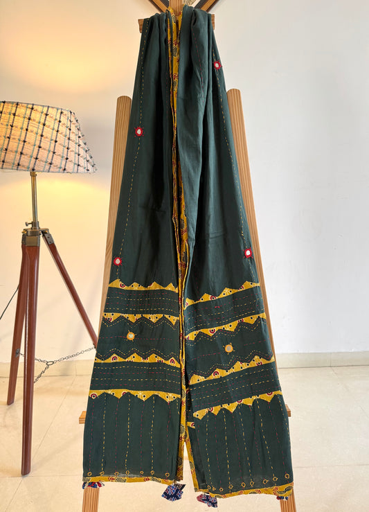 Ajrakh Applique & Kantha Embroidered Dupatta ~ Basil Green