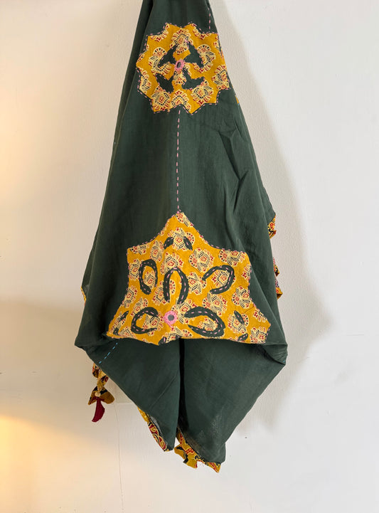 Ajrakh Applique & Kantha Embroidered Dupatta ~ Olive Green and Yellow