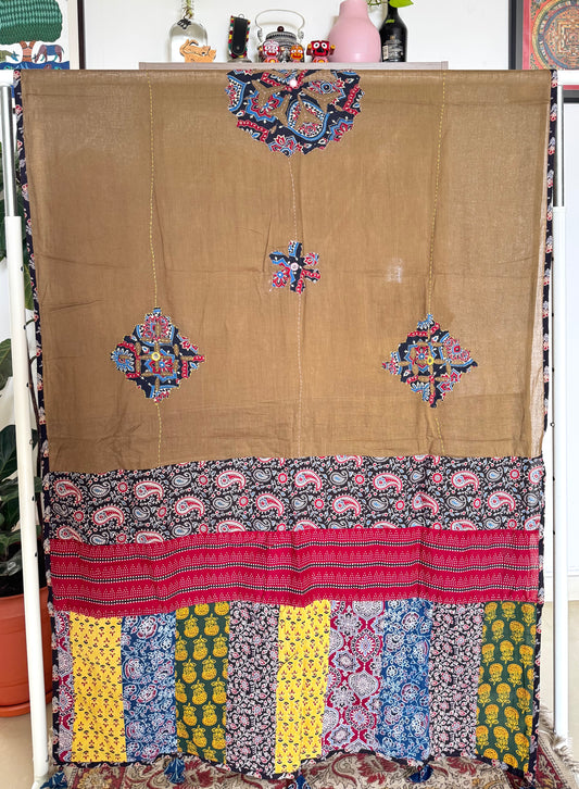 Ajrakh Applique & Kantha Embroidered Dupatta ~ Coco Brown w/ Yellow