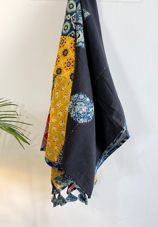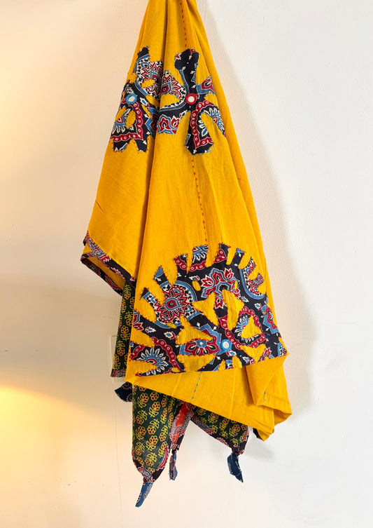Ajrakh Applique & Kantha Embroidered Dupatta ~ Black & Yellow