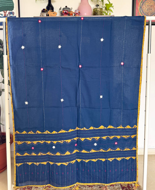 Ajrakh Applique & Kantha Embroidered Dupatta ~ Navy Blue with Mustard Flowers