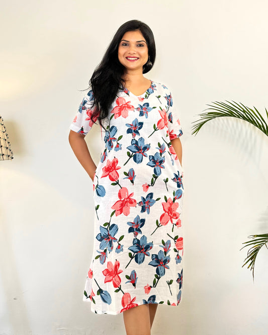 Khushi ~ White & Pink Cotton Dress ~ Spring Lilies
