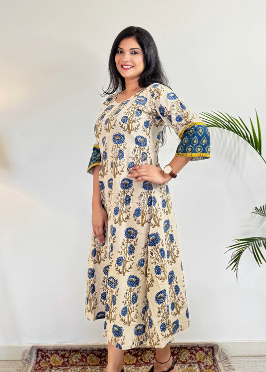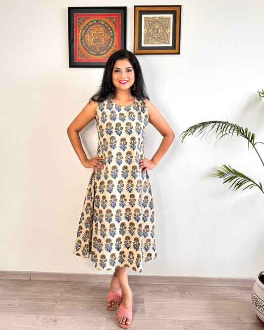 Noor 9 to 5 Ajrakh Dress ~ Ivory white & indigo blue