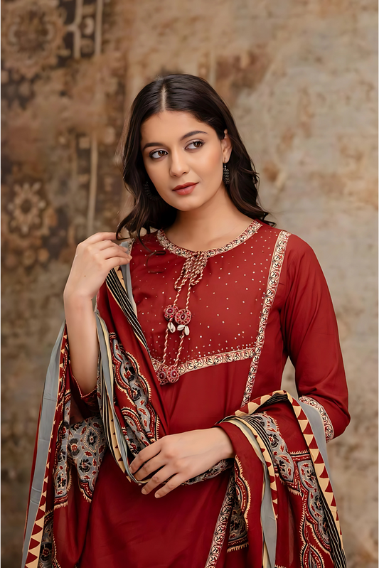 Saanjh 𓂃 ོ☼𓂃 Ajrakh Hand Embroidered Suit ~ Mahogany Red