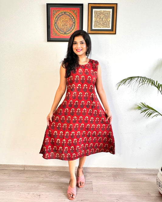 Noor 9 to 5 Ajrakh Dress - Mahogany Red - Daisy Print