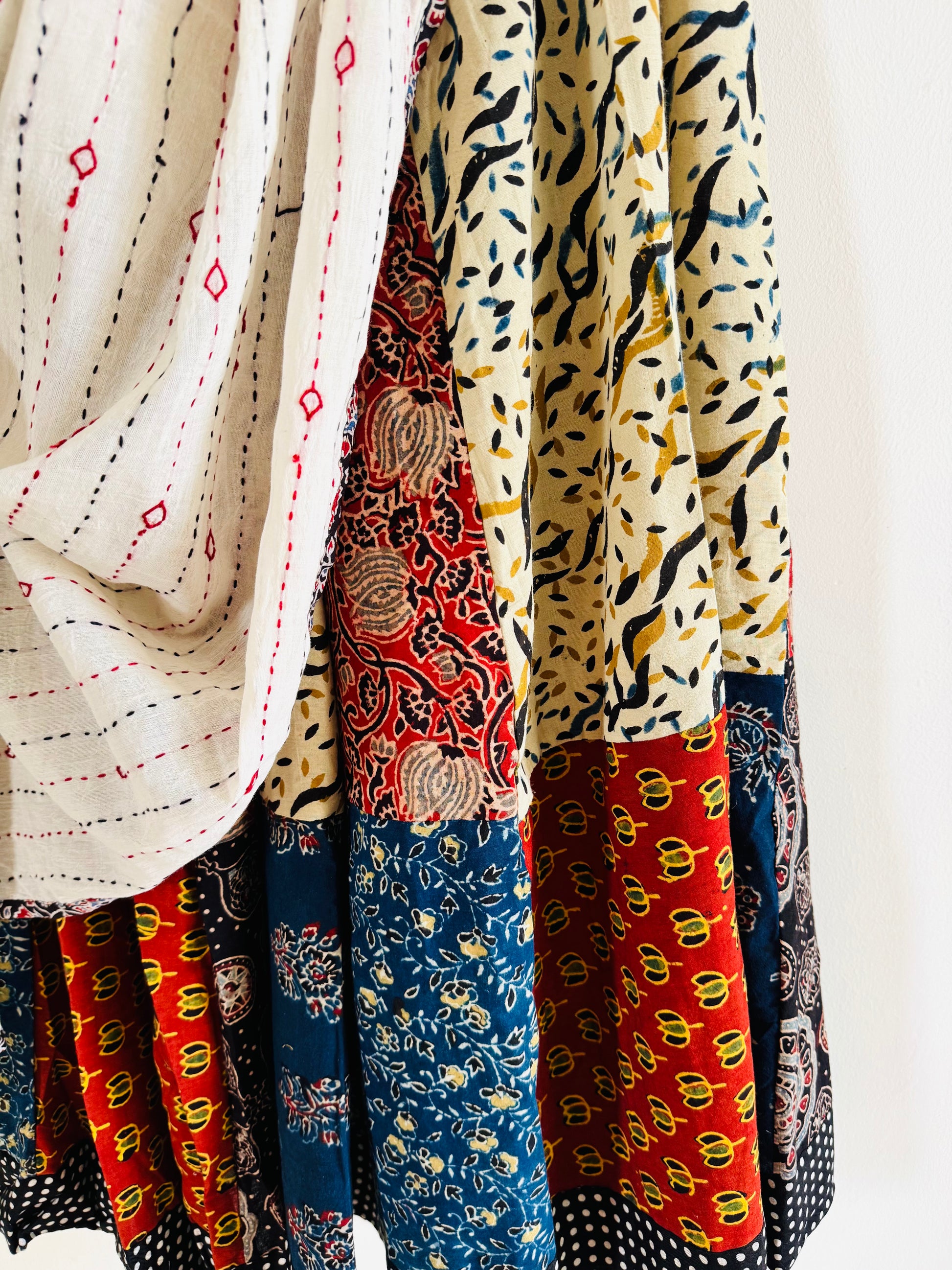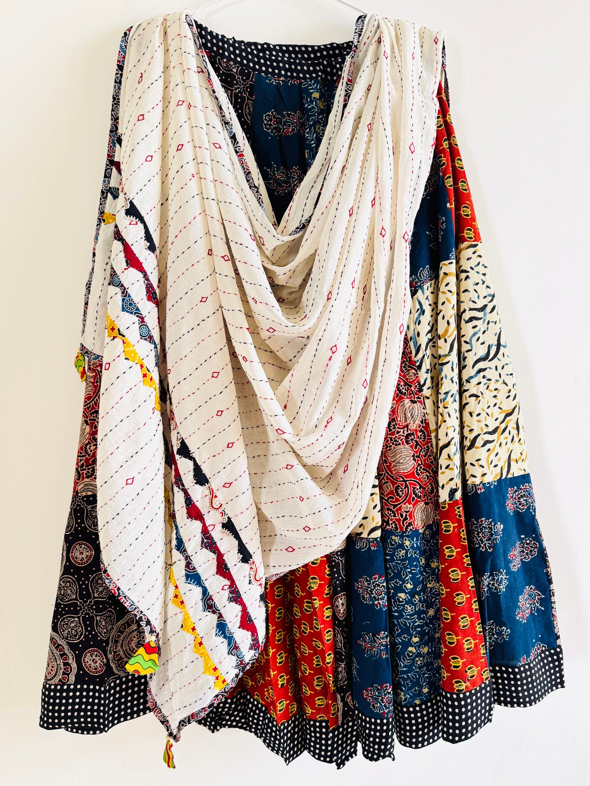 Vibrant appliqué patchwork lehenga skirts and dupattas are handcrafted by women artisans in Barmer using bold Ajrakh patterns, made to twirl through every garba night✨