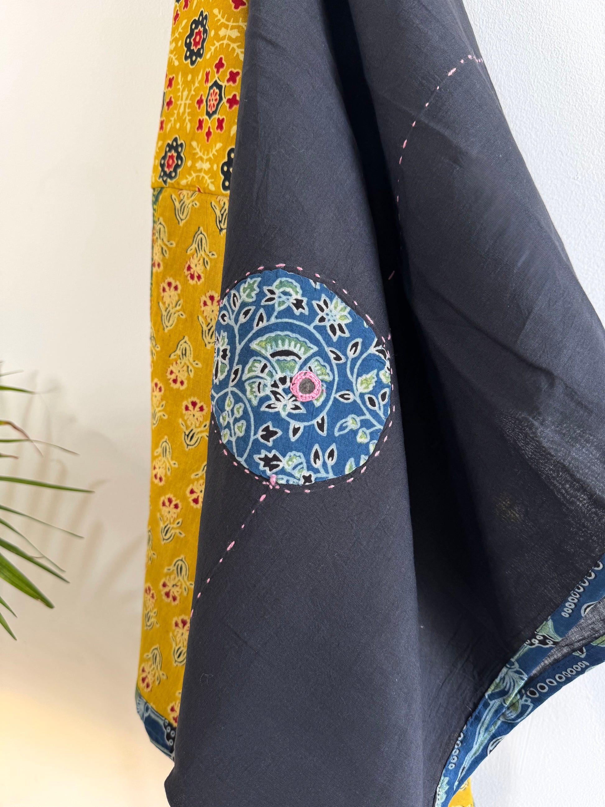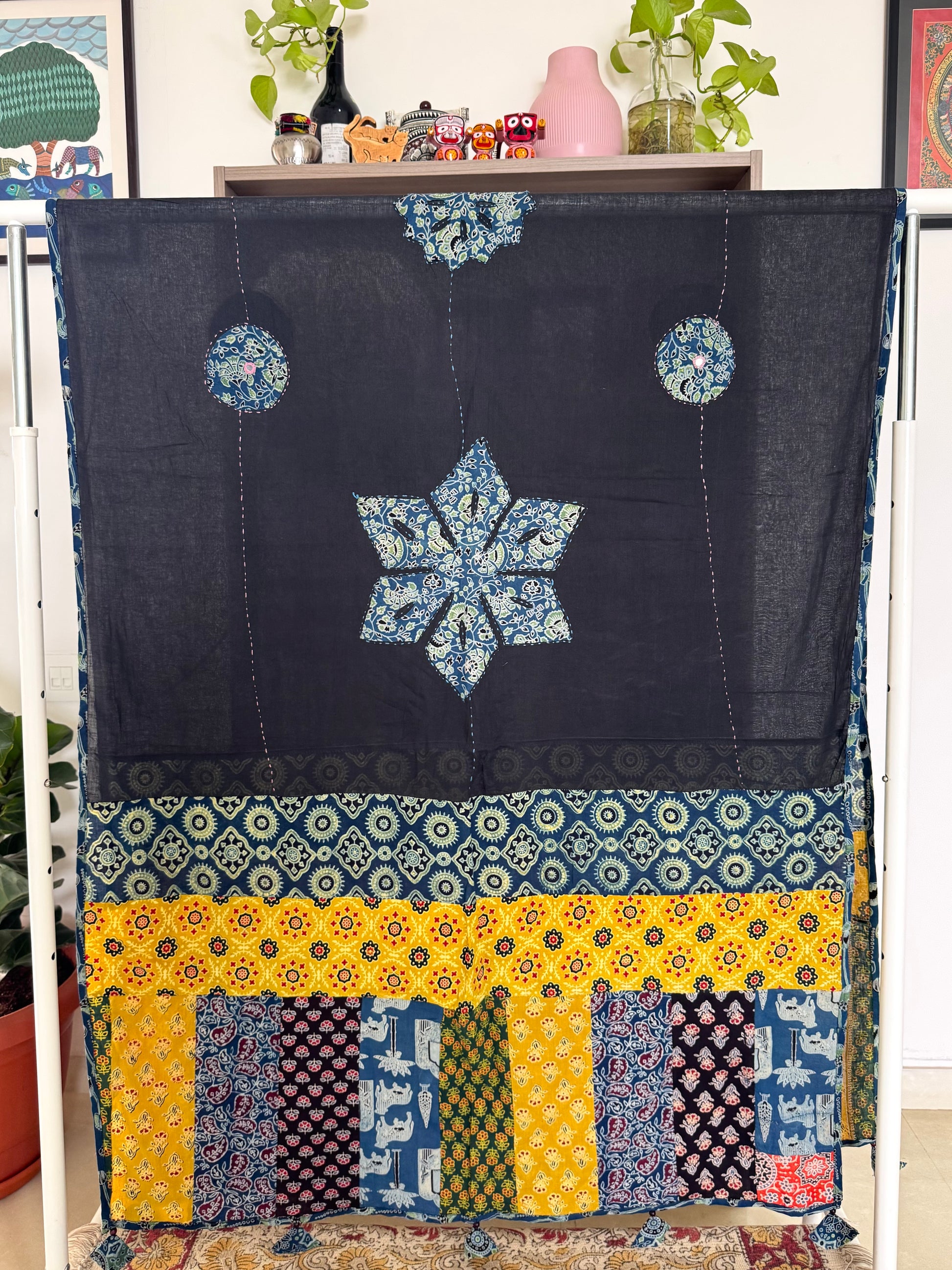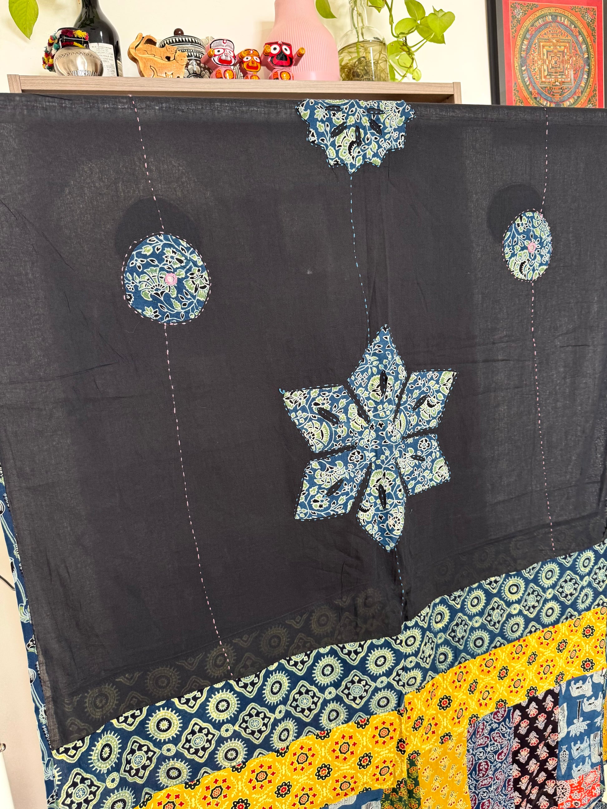 𓂃ོ⋆☀︎𓂃ᨒོ Ajrakh, Applique & Kantha Embroidered Dupatta ~ Black with Blue Crystals𑁍ࠬ