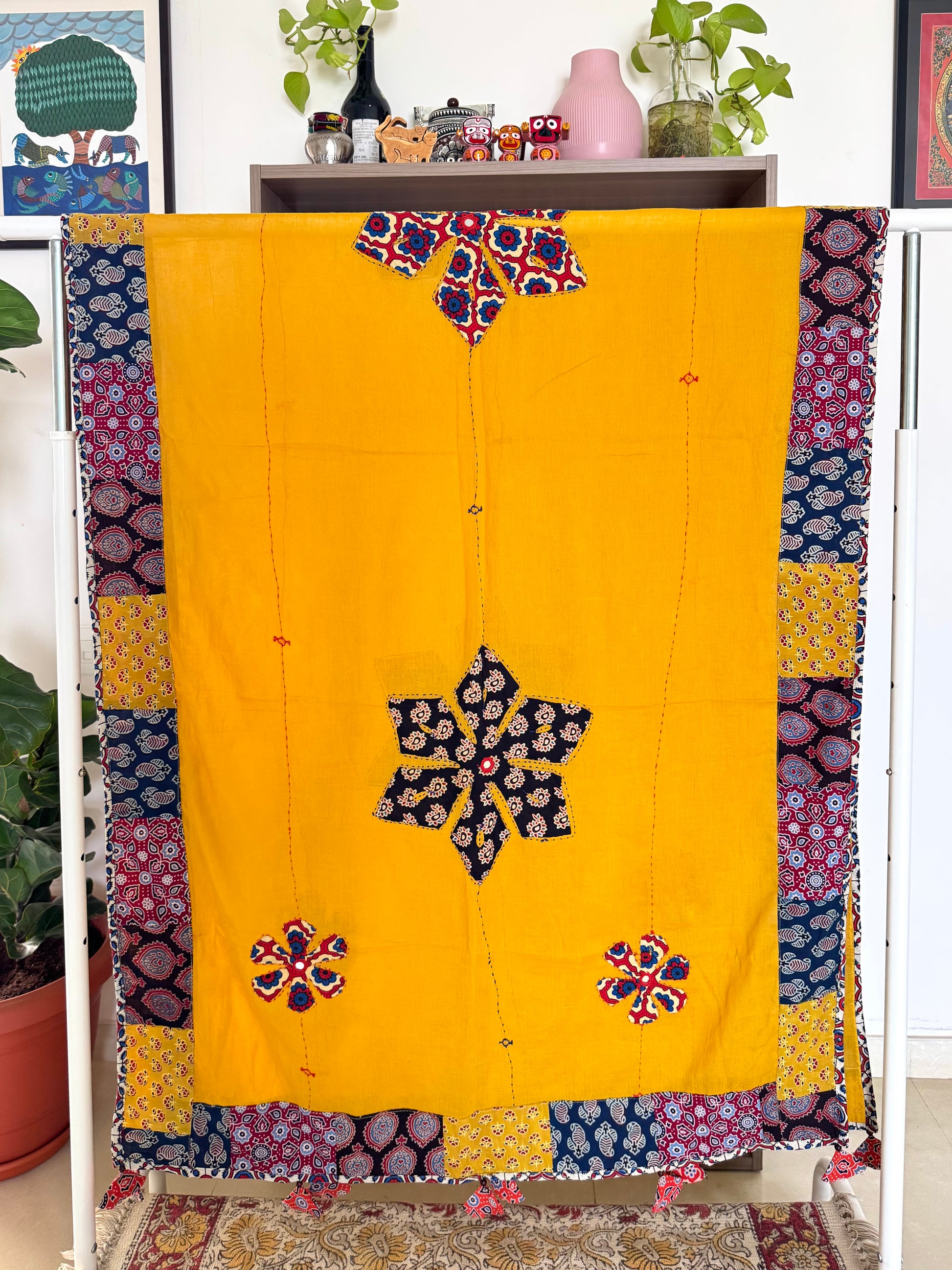 𓂃ོ⋆☀︎𓂃ᨒོ Ajrakh, Applique & Kantha Embroidered Dupatta ~ Amber Yellow 𑁍ࠬ