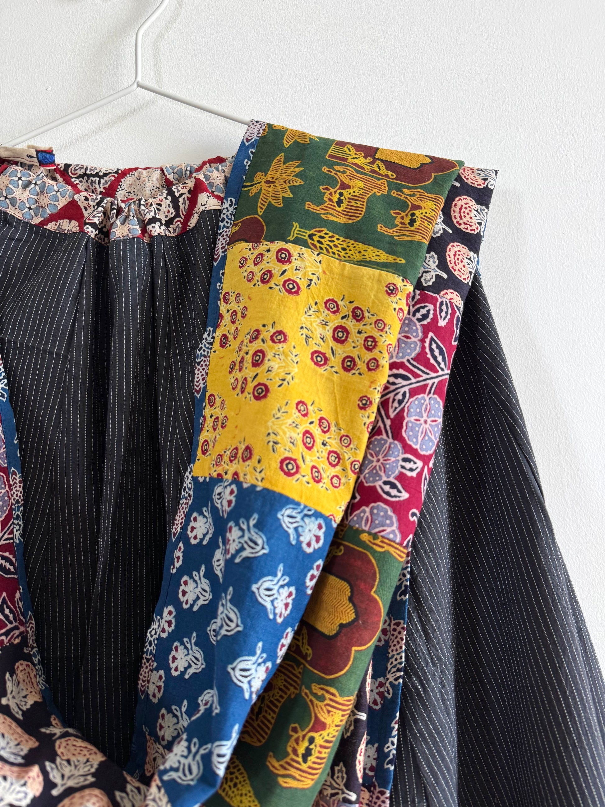 Vibrant appliqué patchwork lehenga skirts and dupattas are handcrafted by women artisans in Barmer using bold Ajrakh patterns, made to twirl through every garba night✨