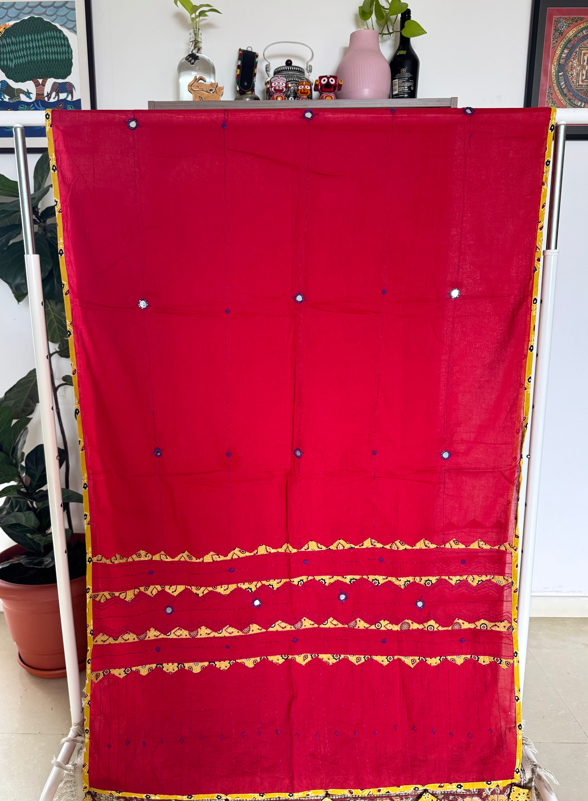 Ajrakh Applique & Kantha Embroidered Dupatta ~ Cherry Red w/ Yellow Work