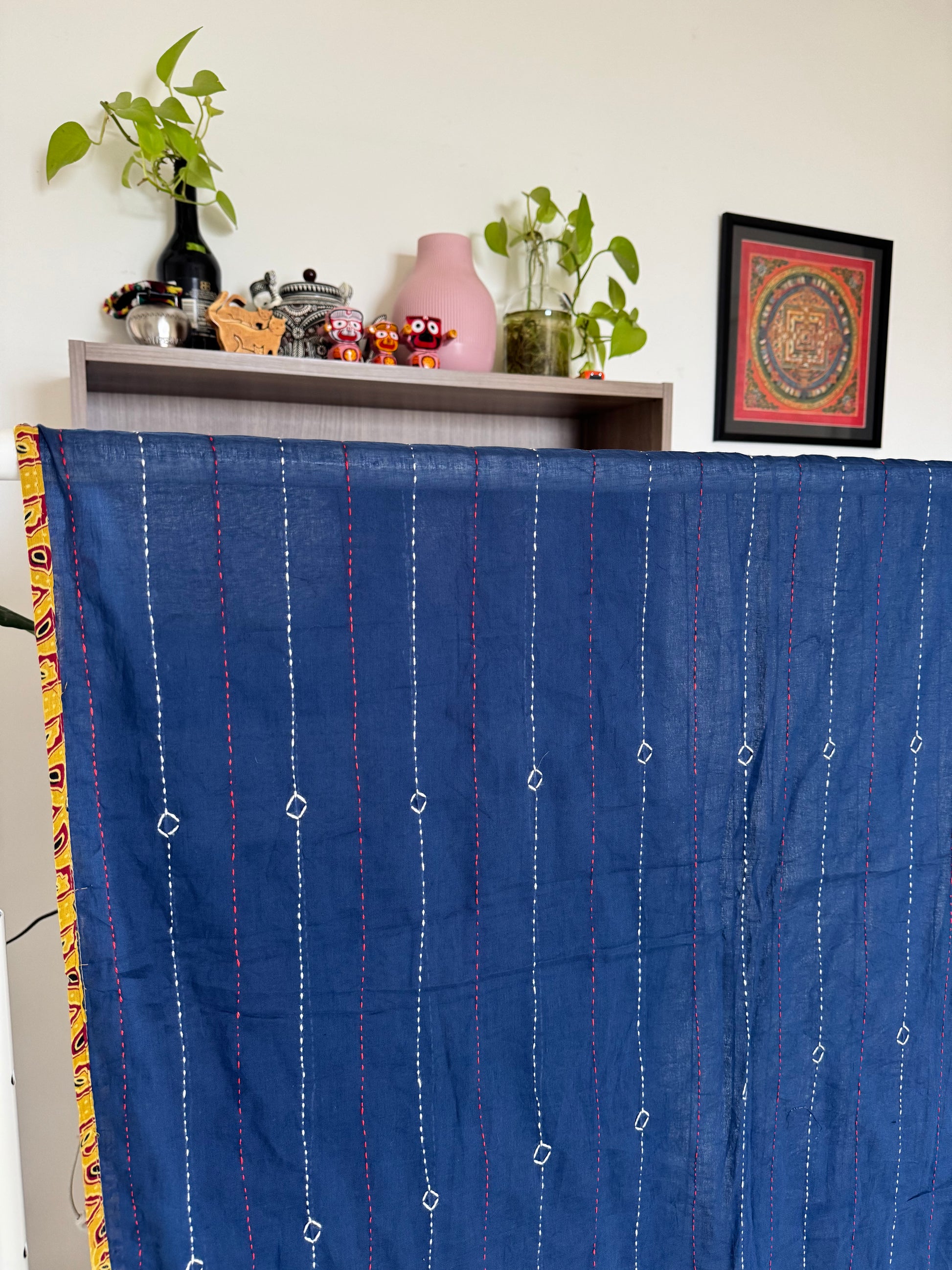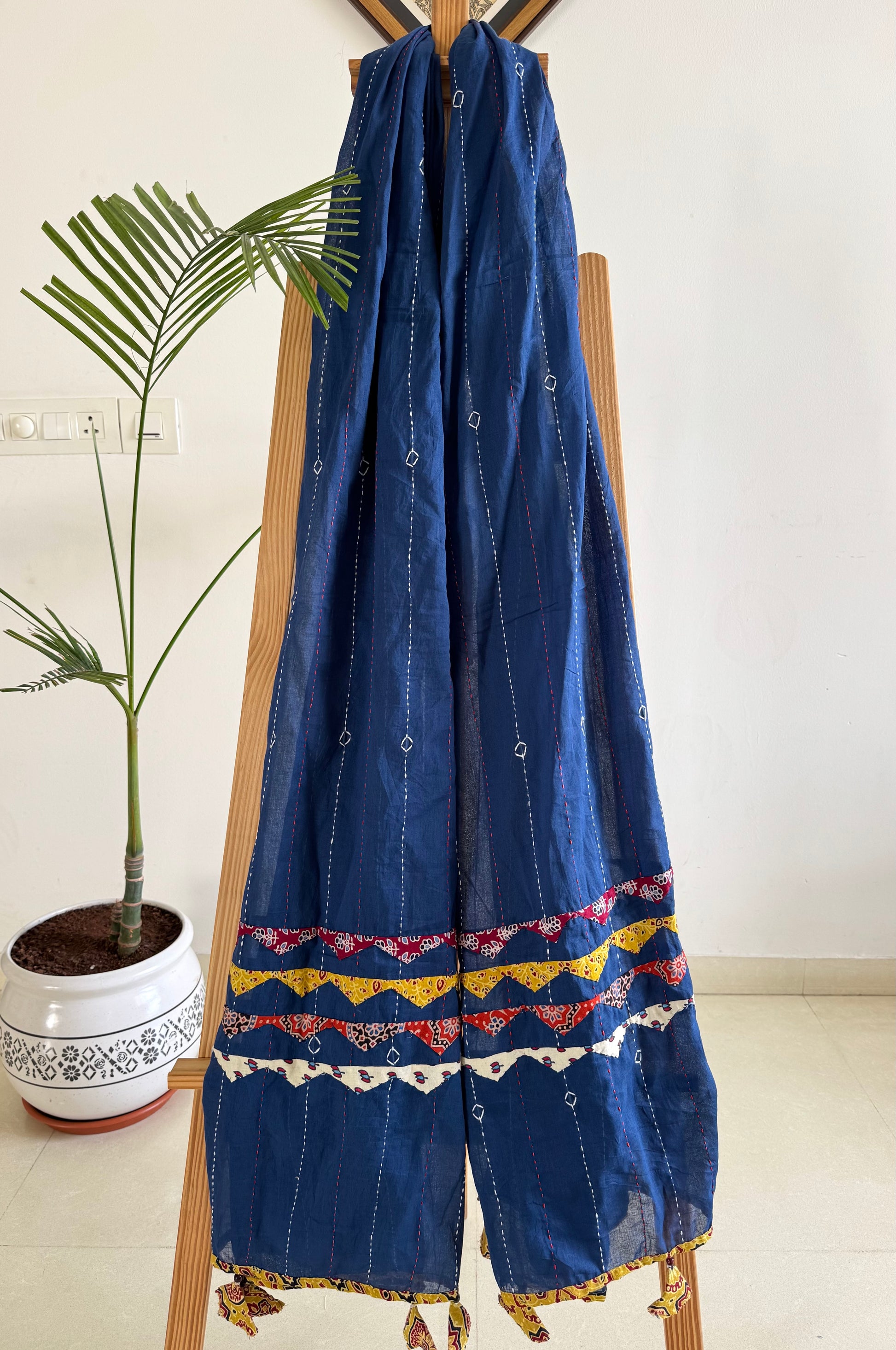 Ajrakh Applique & Kantha Embroidered Dupatta ~ Navy Blue with Multicolor Patch Work
