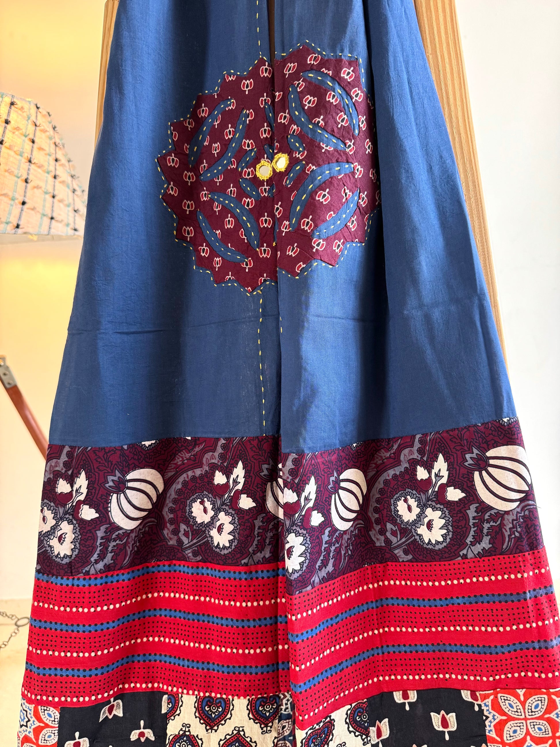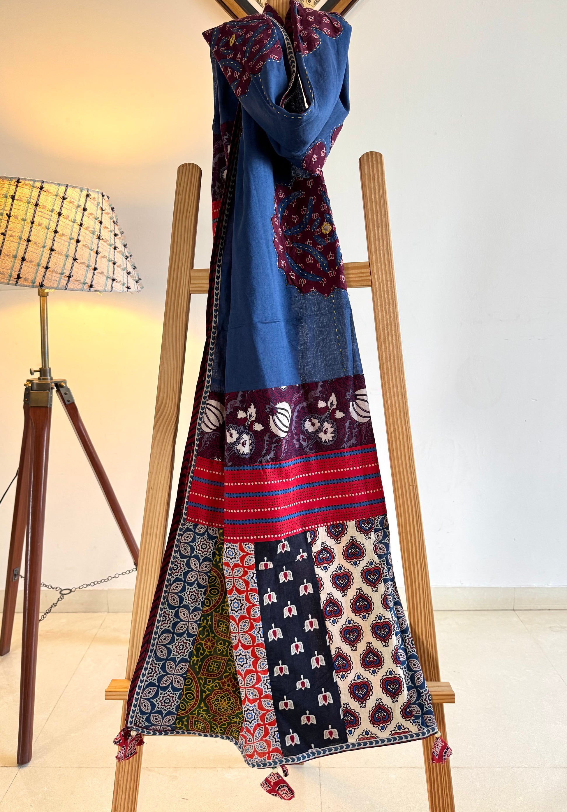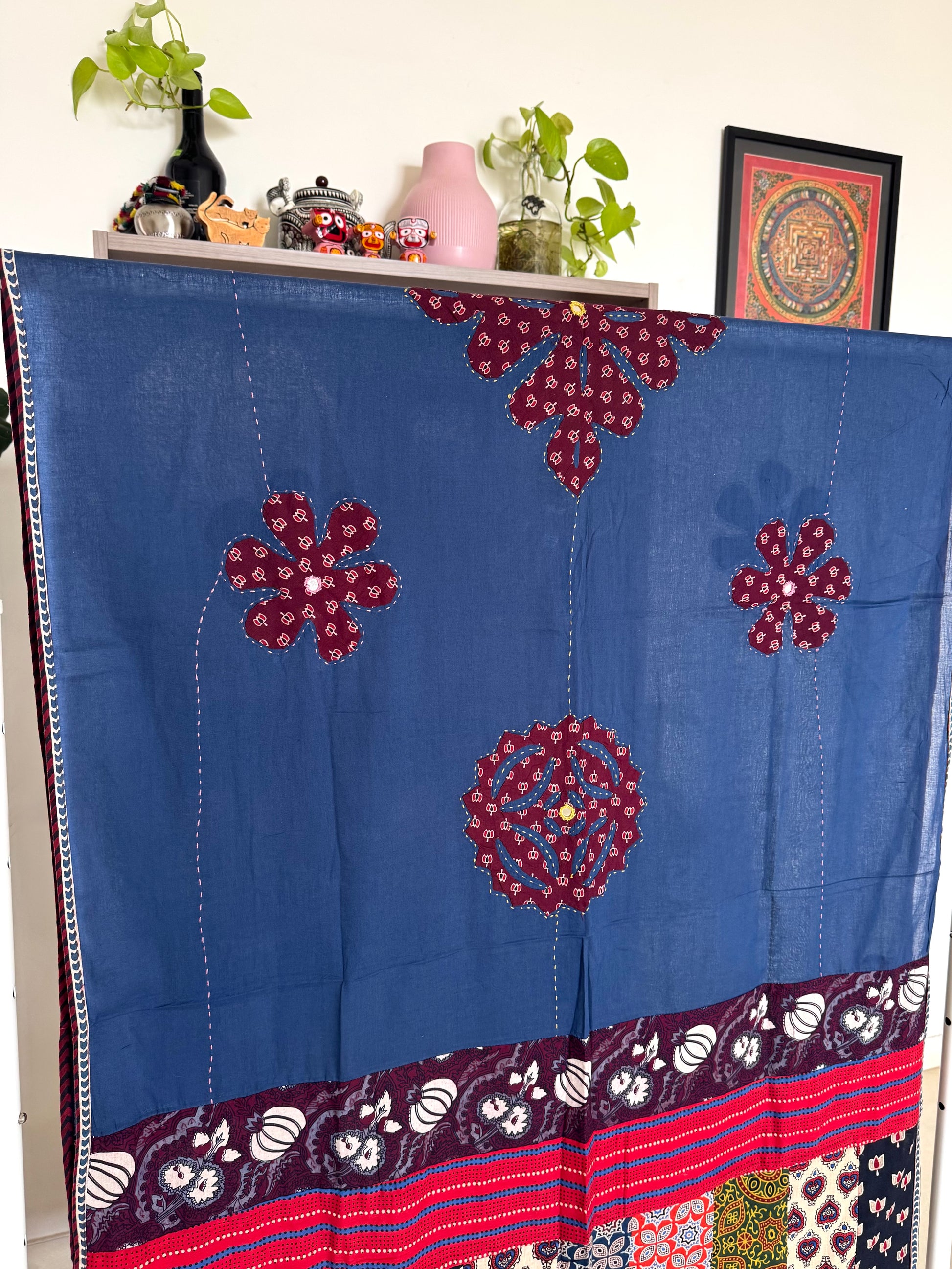 Ajrakh Applique & Kantha Embroidered Dupatta ~ Navy Blue with Burgundy Flowers