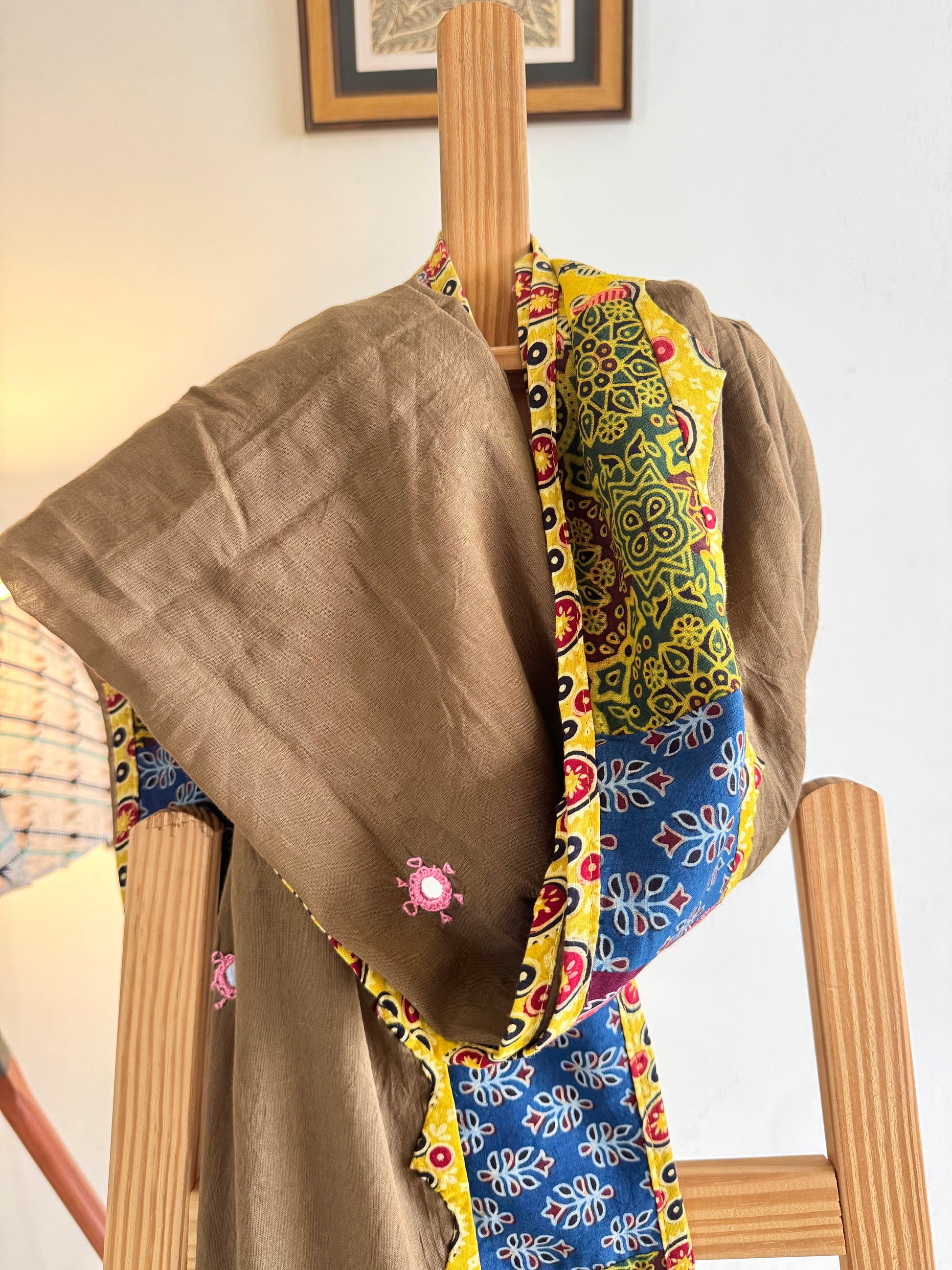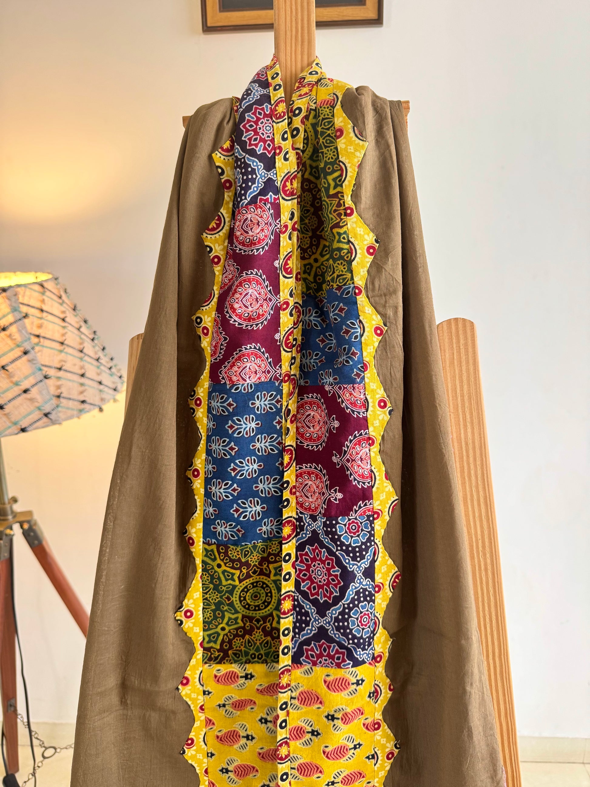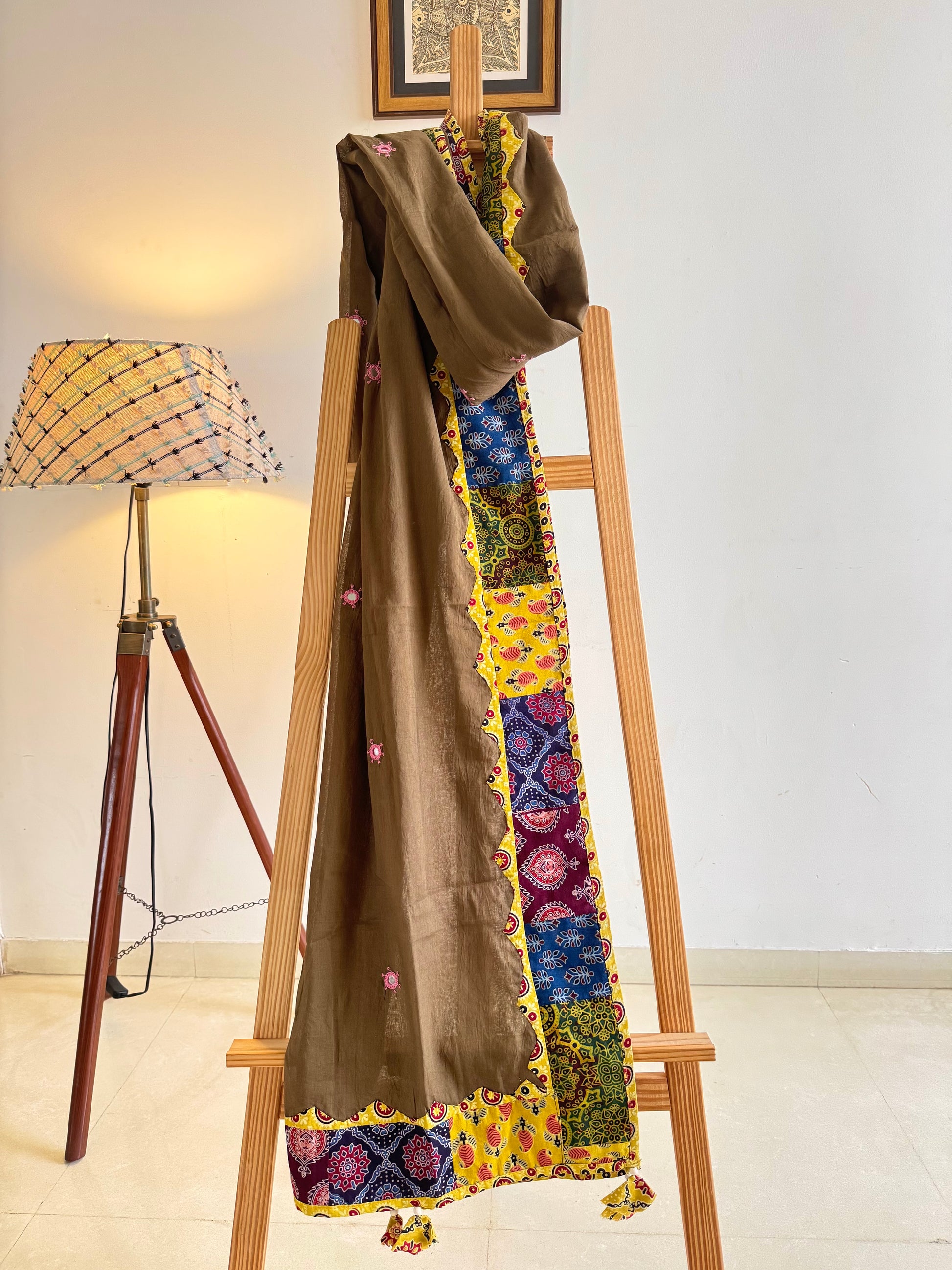 Ajrakh Applique & Kantha Embroidered Dupatta ~ Coco Brown w/ Yellow