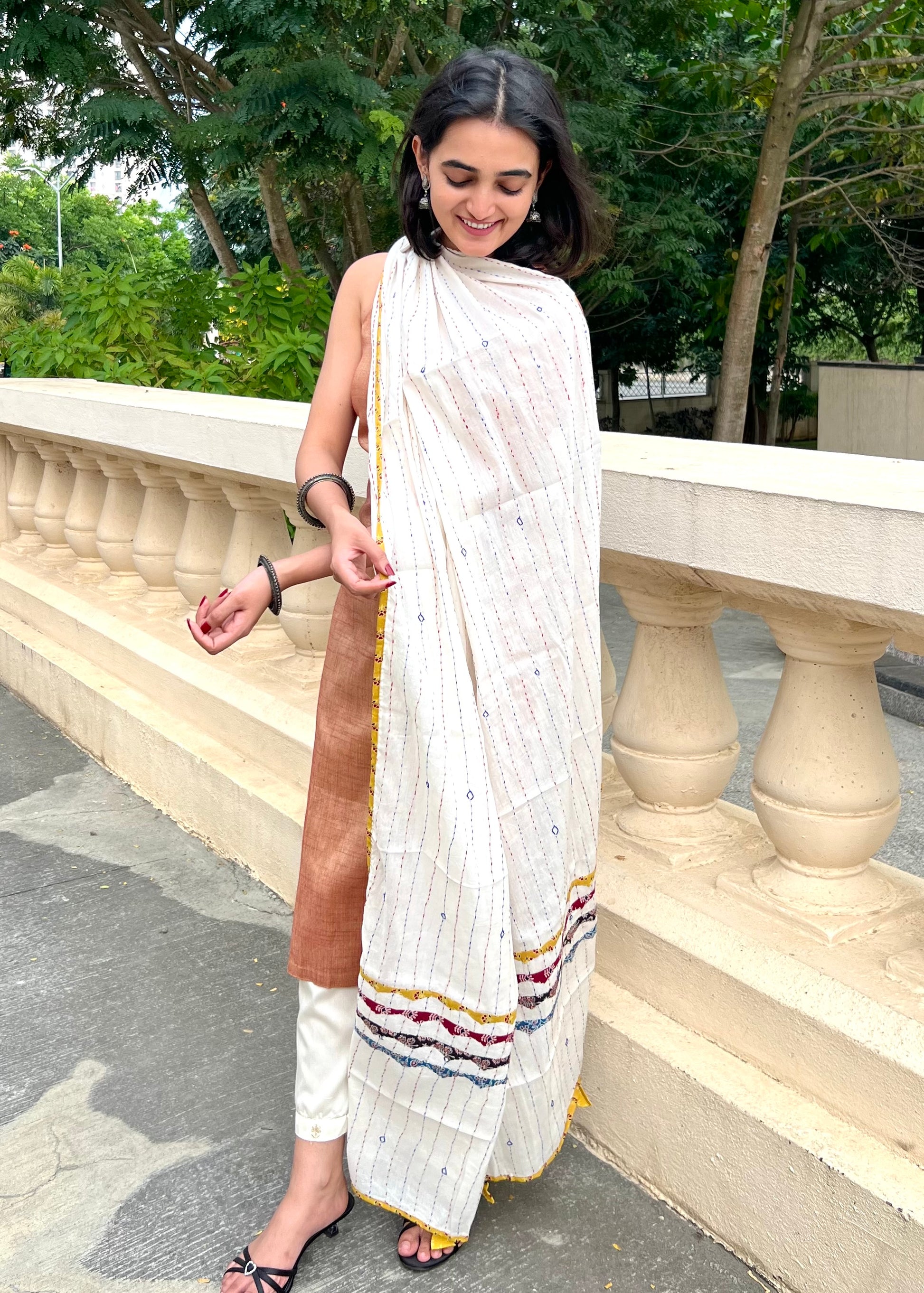 Ajrakh Applique & Kantha Embroidered Dupatta ~ White with Multicolor Patchwork