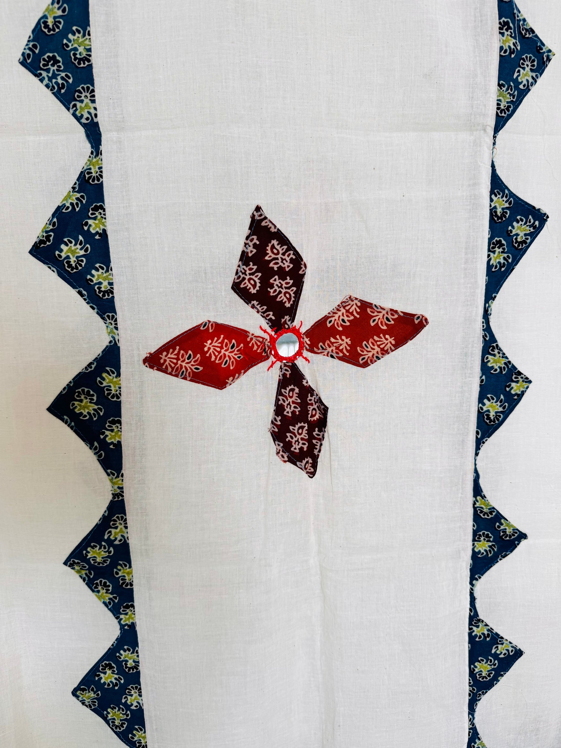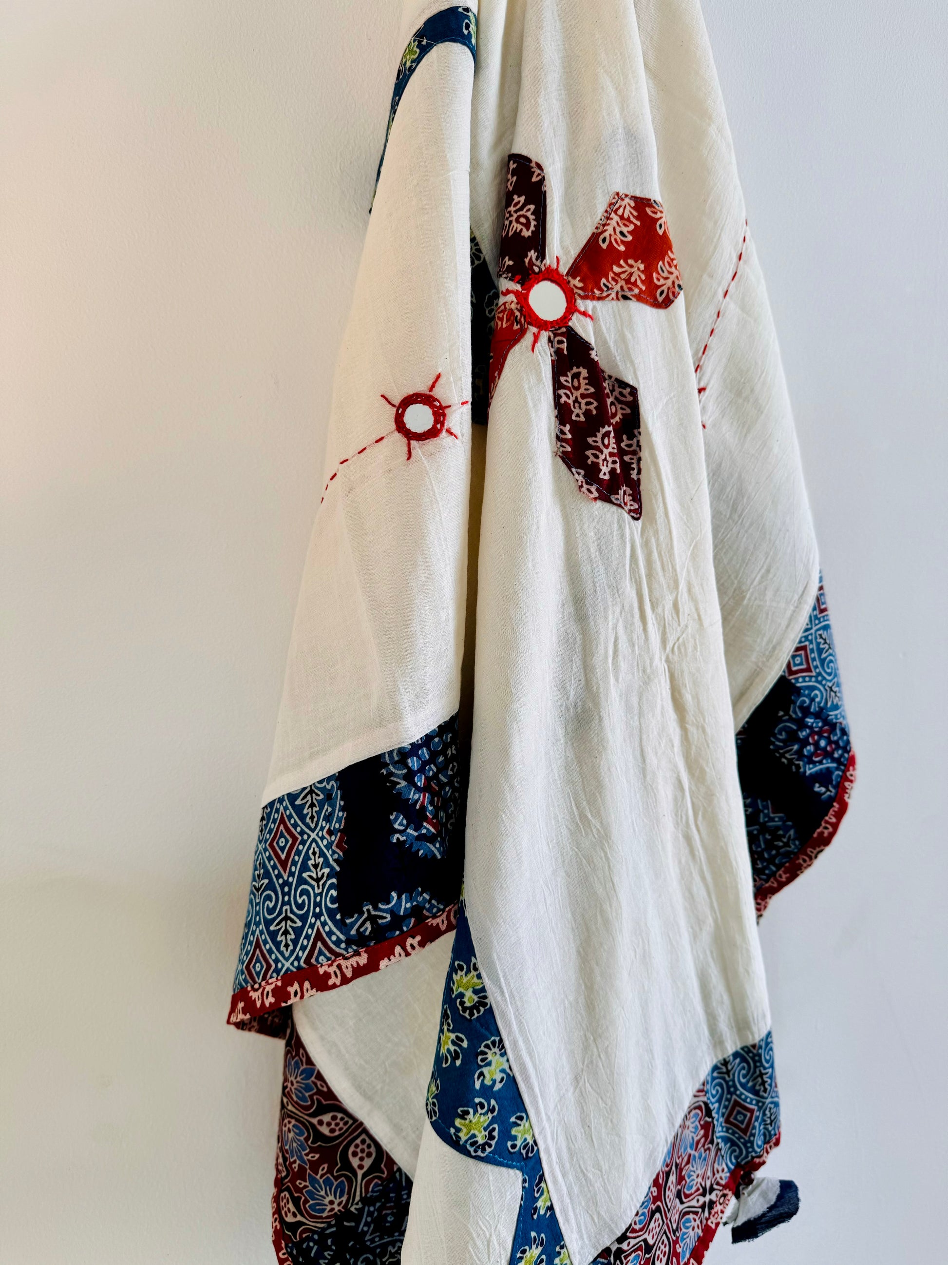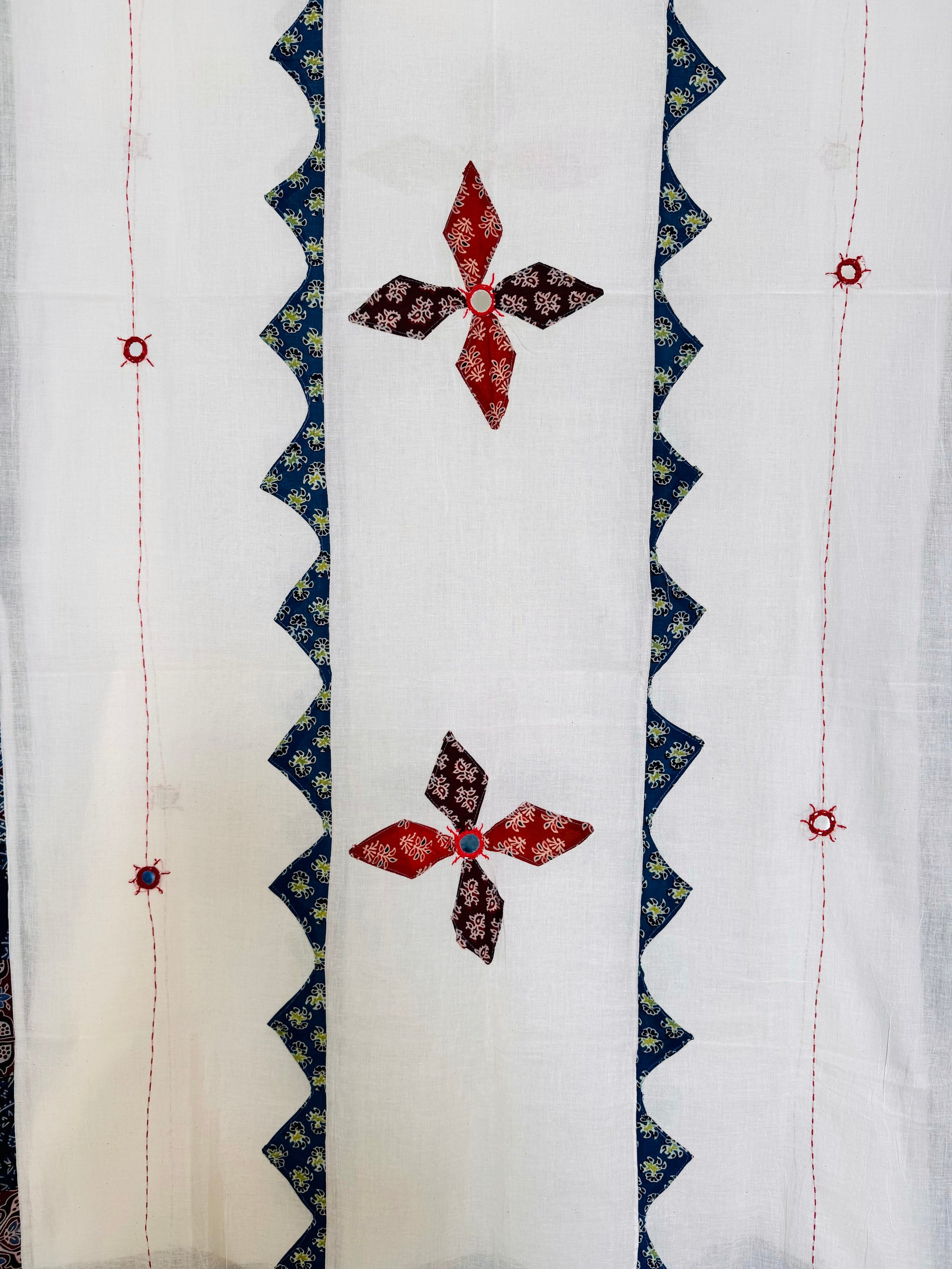 Ajrakh Applique & Kantha Embroidered Dupatta ~ White with Burnt Orange Flowers