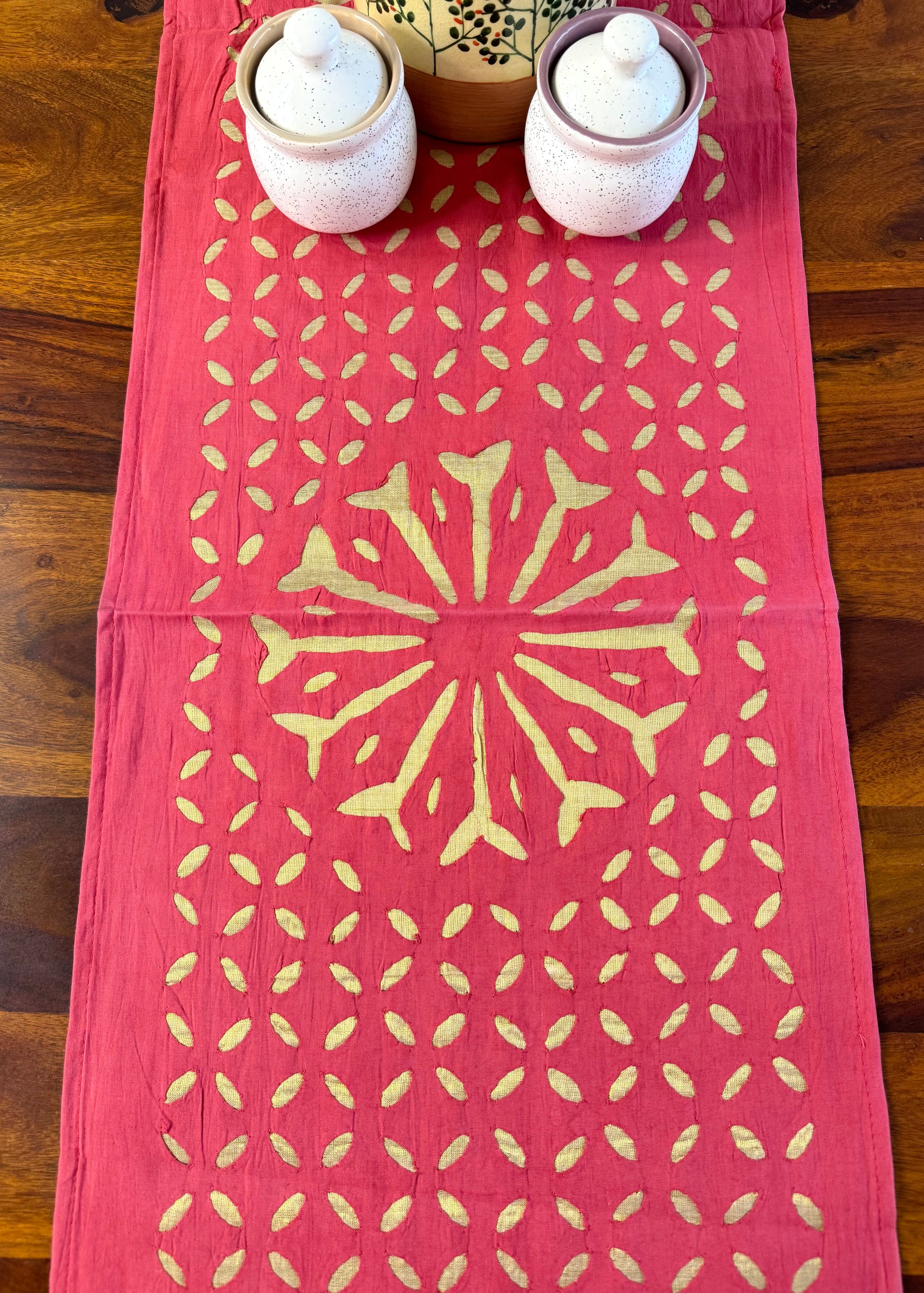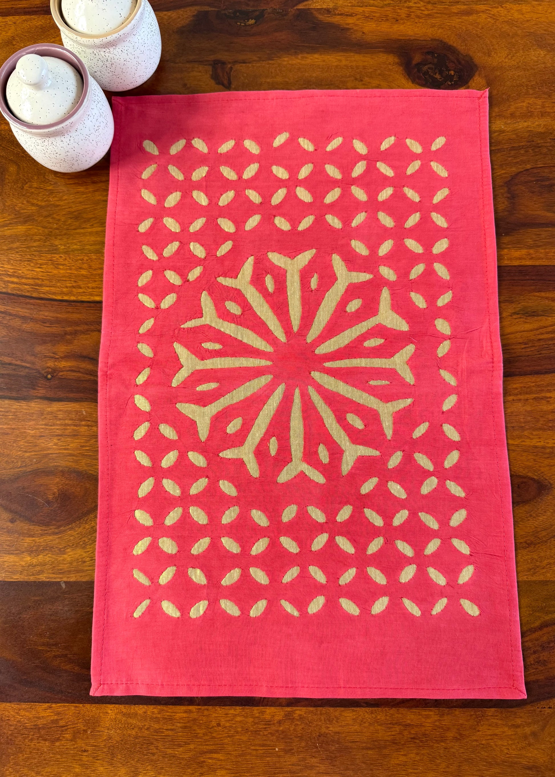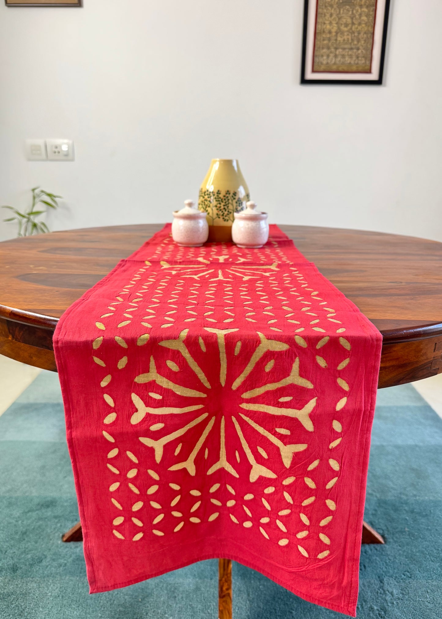 Bring warmth and colour to your table with this elegant appliqué work dining table set, crafted in Barmer, Rajasthan.