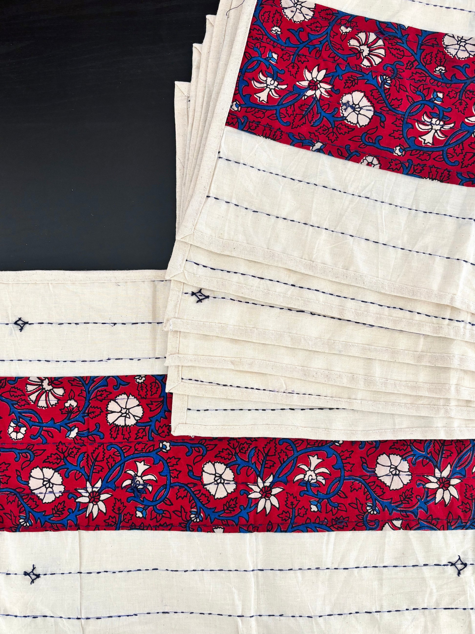 White & Red ~ Ajrakh & Kantha Table Runner w/ Mats