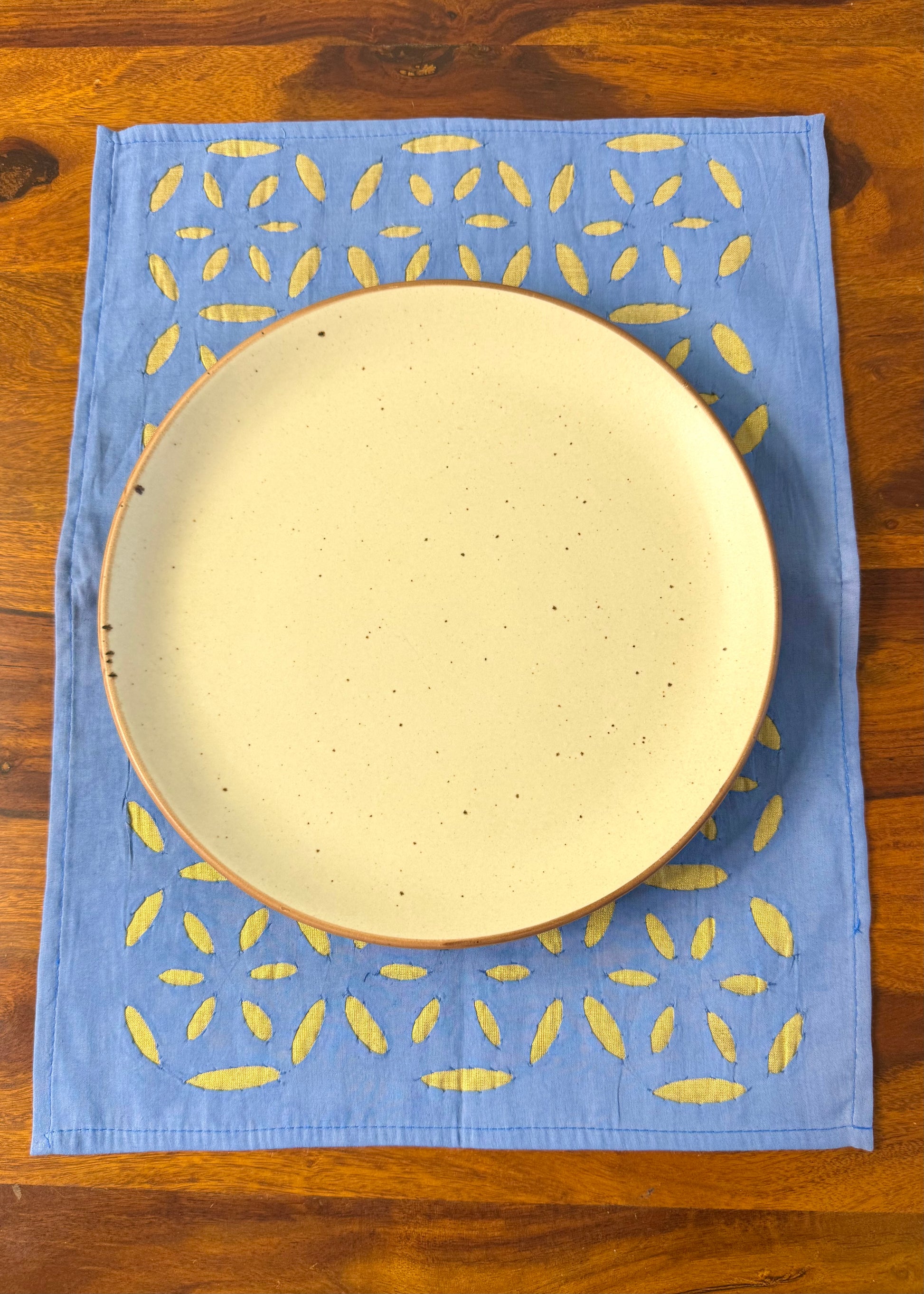 Intricate cutwork creates a beautiful play of light and shadow, while fine cotton and chanderi keeps it glittery and sturdy. Perfect for meals that echo smiles and laughter.