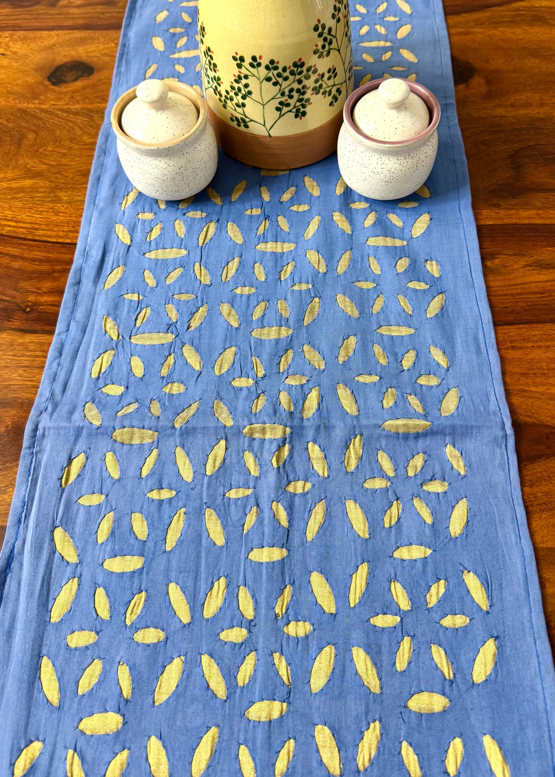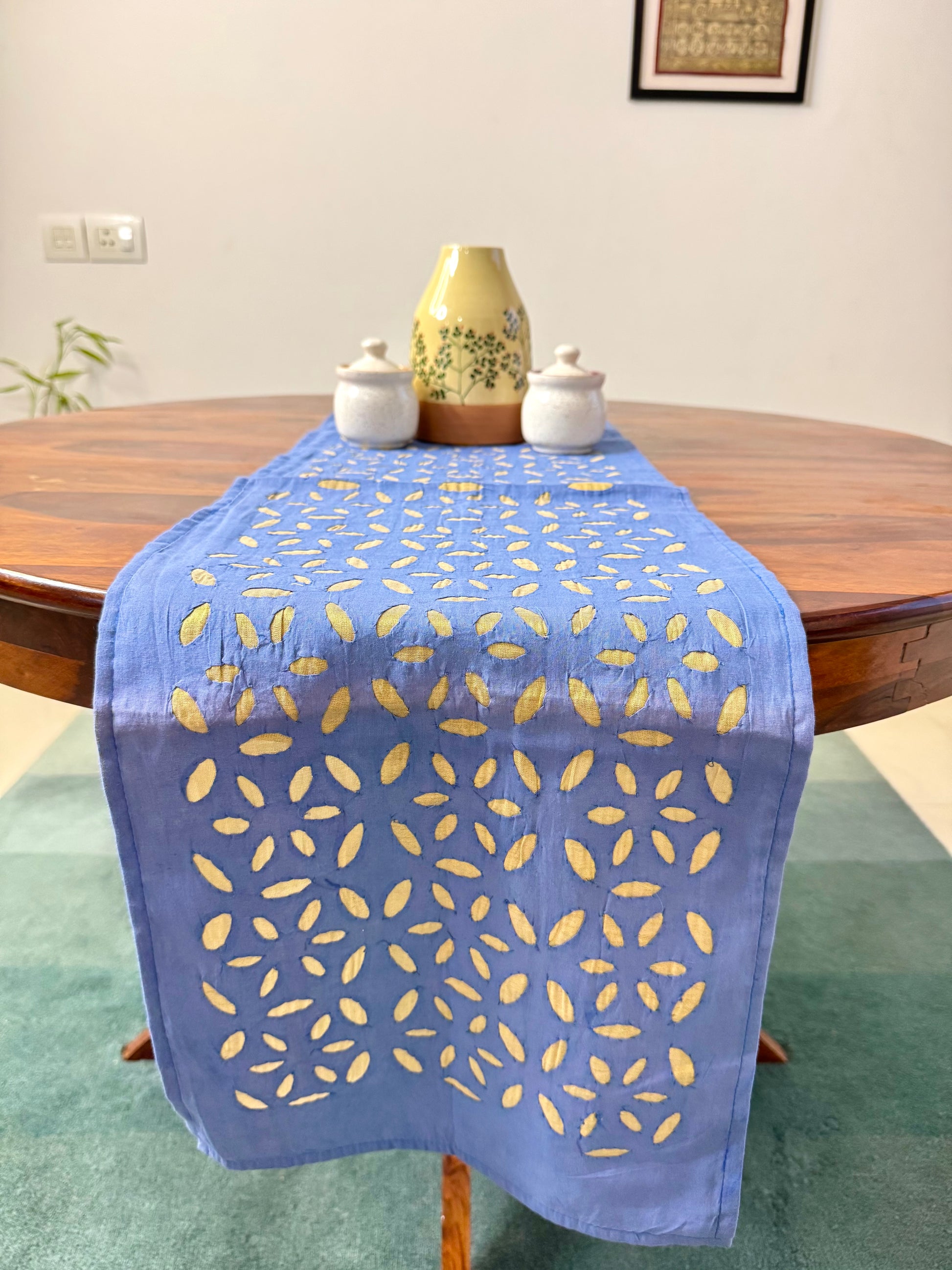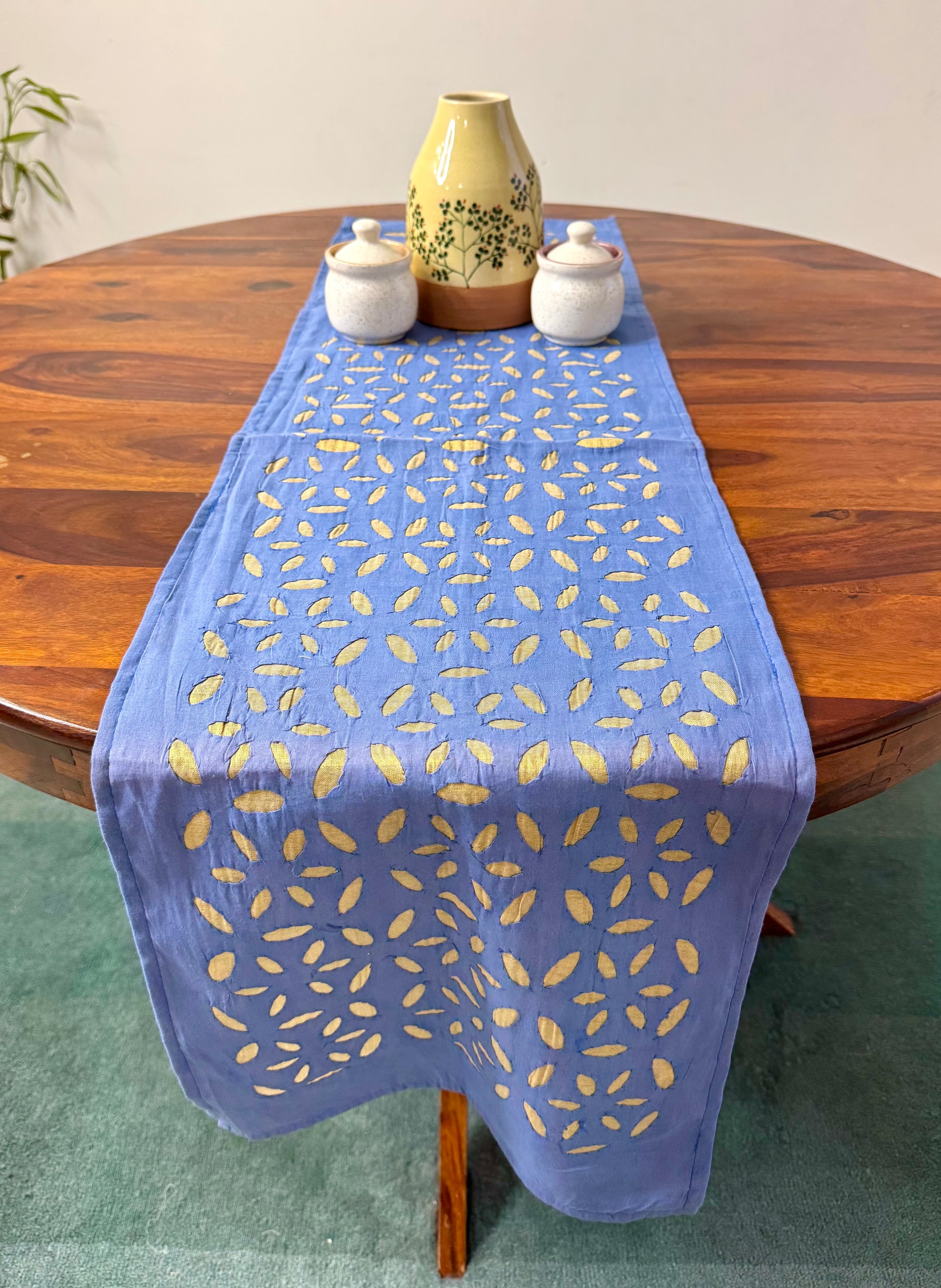 Bring warmth and colour to your table with this elegant appliqué work dining table set, crafted in Barmer, Rajasthan.