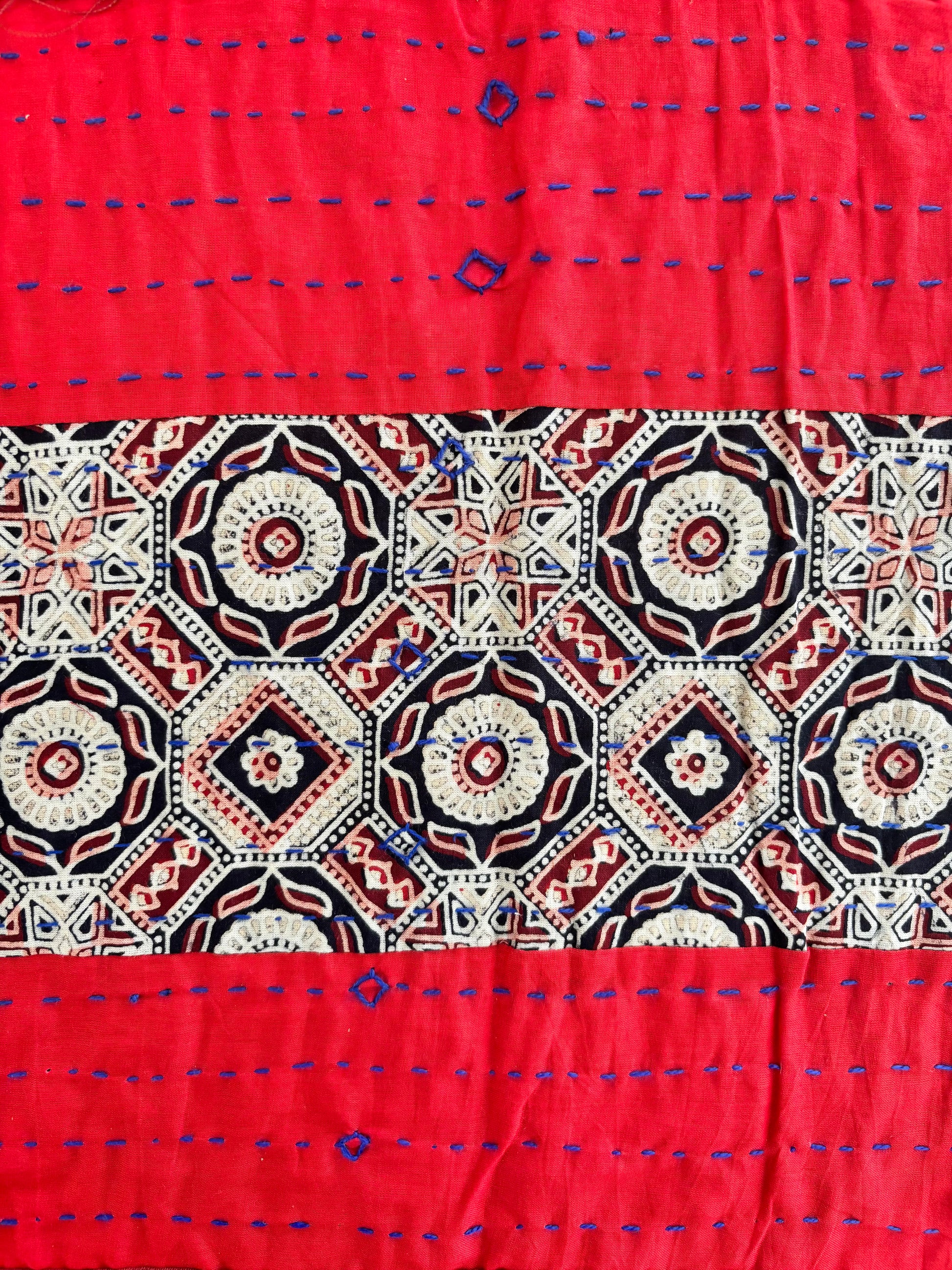 Rooted in Indian textile craft, this table runner and mat set brings together the heritage craft of Ajrakh handblock and Kantha embroidery, finished with appliquĆ© for a layered, tactile feelāØ