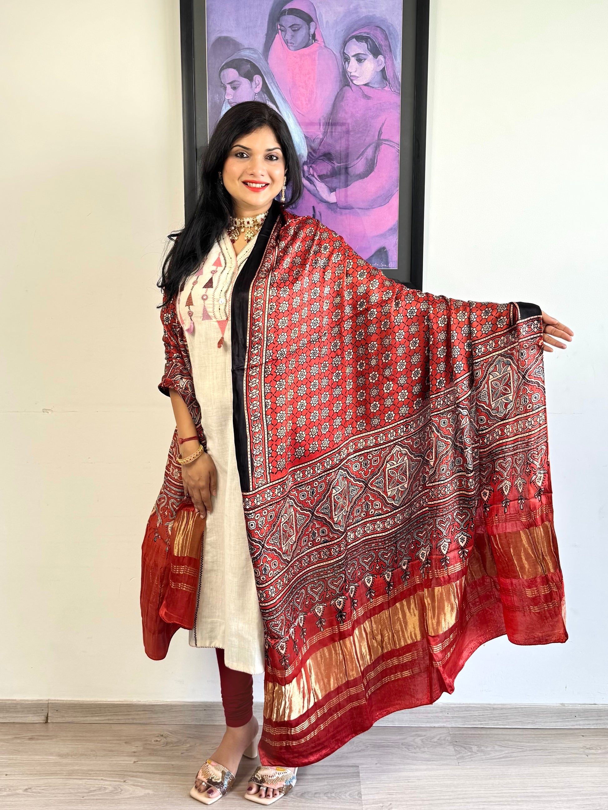 Modal Silk Ajrakh Dupatta ~ Brick Red Jharokha Motif w/ Zari