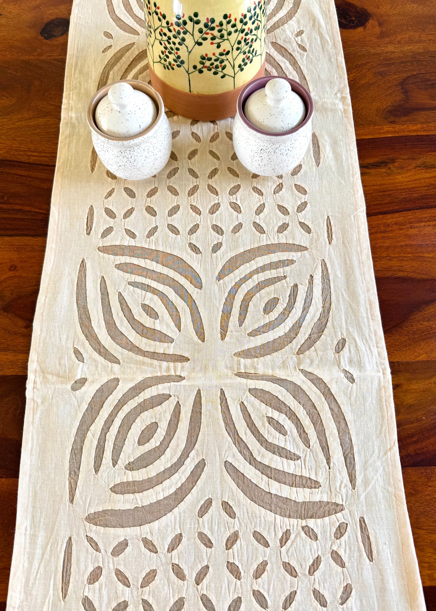 Bring warmth and colour to your table with this elegant appliqué work dining table set, crafted in Barmer, Rajasthan.