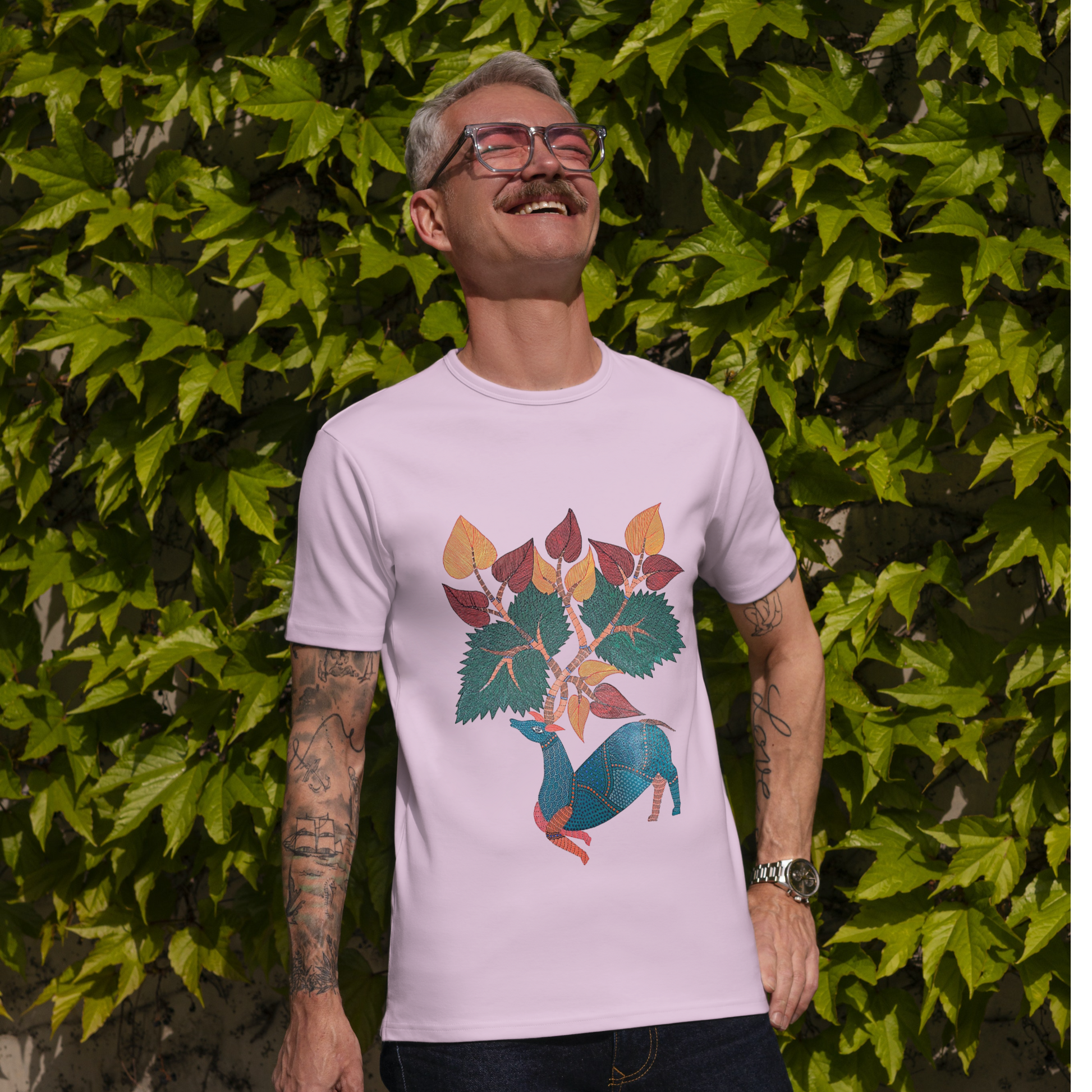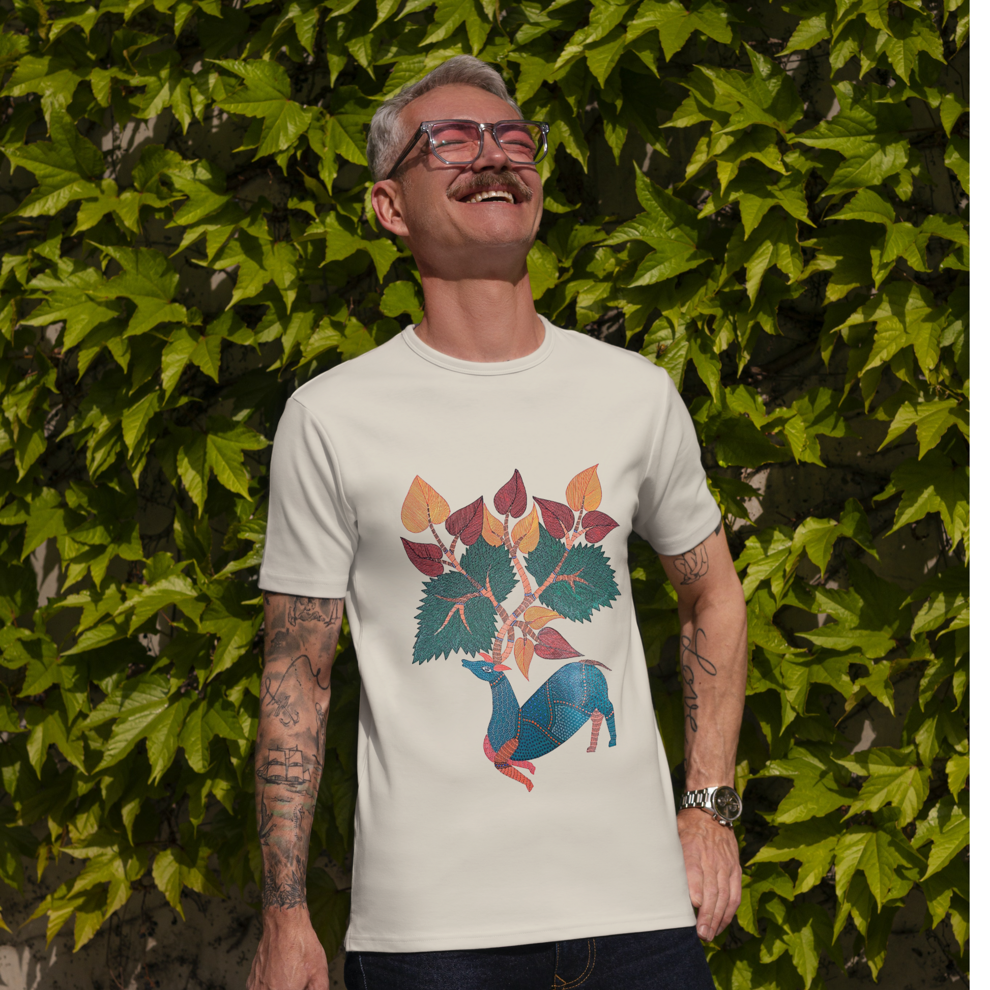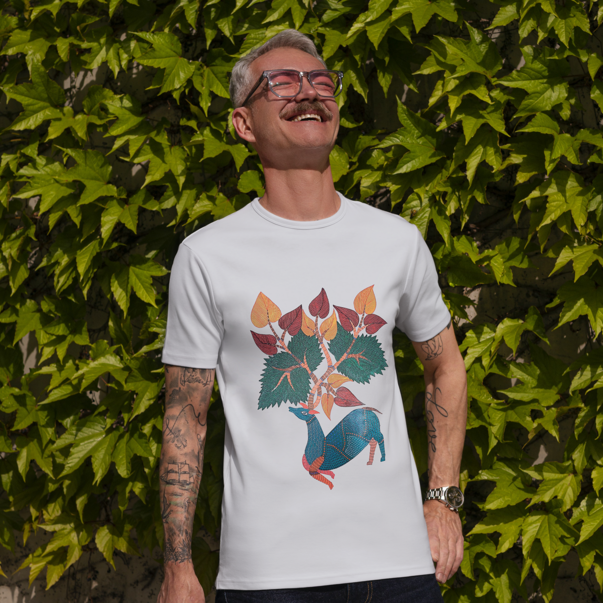 Gond art pure cotton t-shirts 'hand-painted' by our tribal artist, Kailash Pradhan from Amarkantak.