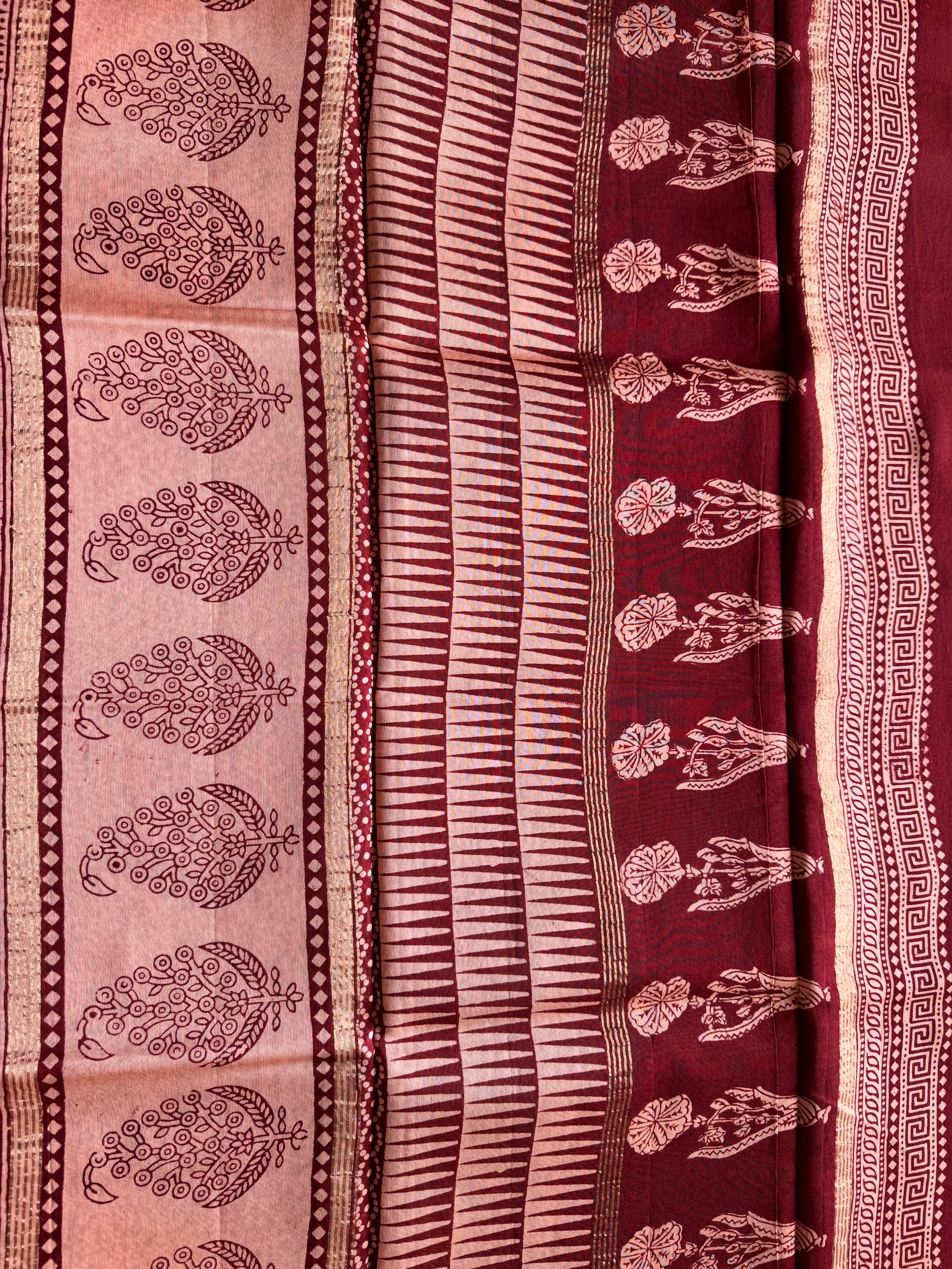 Handcrafted by our artisans in the historic town of Maheshwar, these exquisite Maheshwari sarees feature traditional Bagh handblock prints. They are dyed with natural colors derived from fruits, flowers, and spices like pomegranate peels, turmeric, etc.
