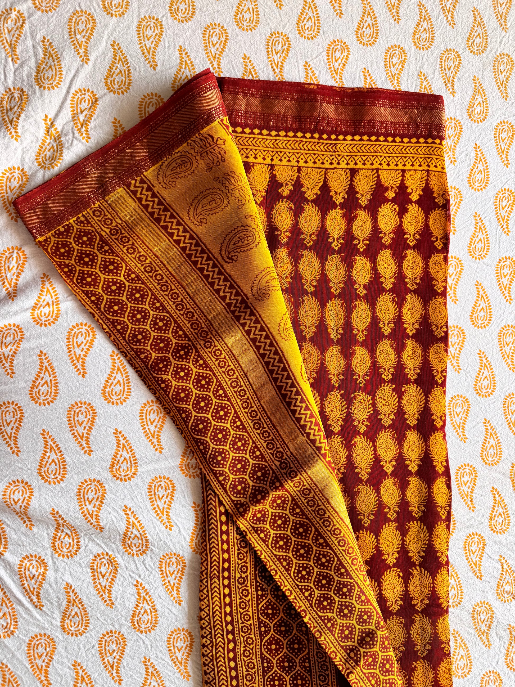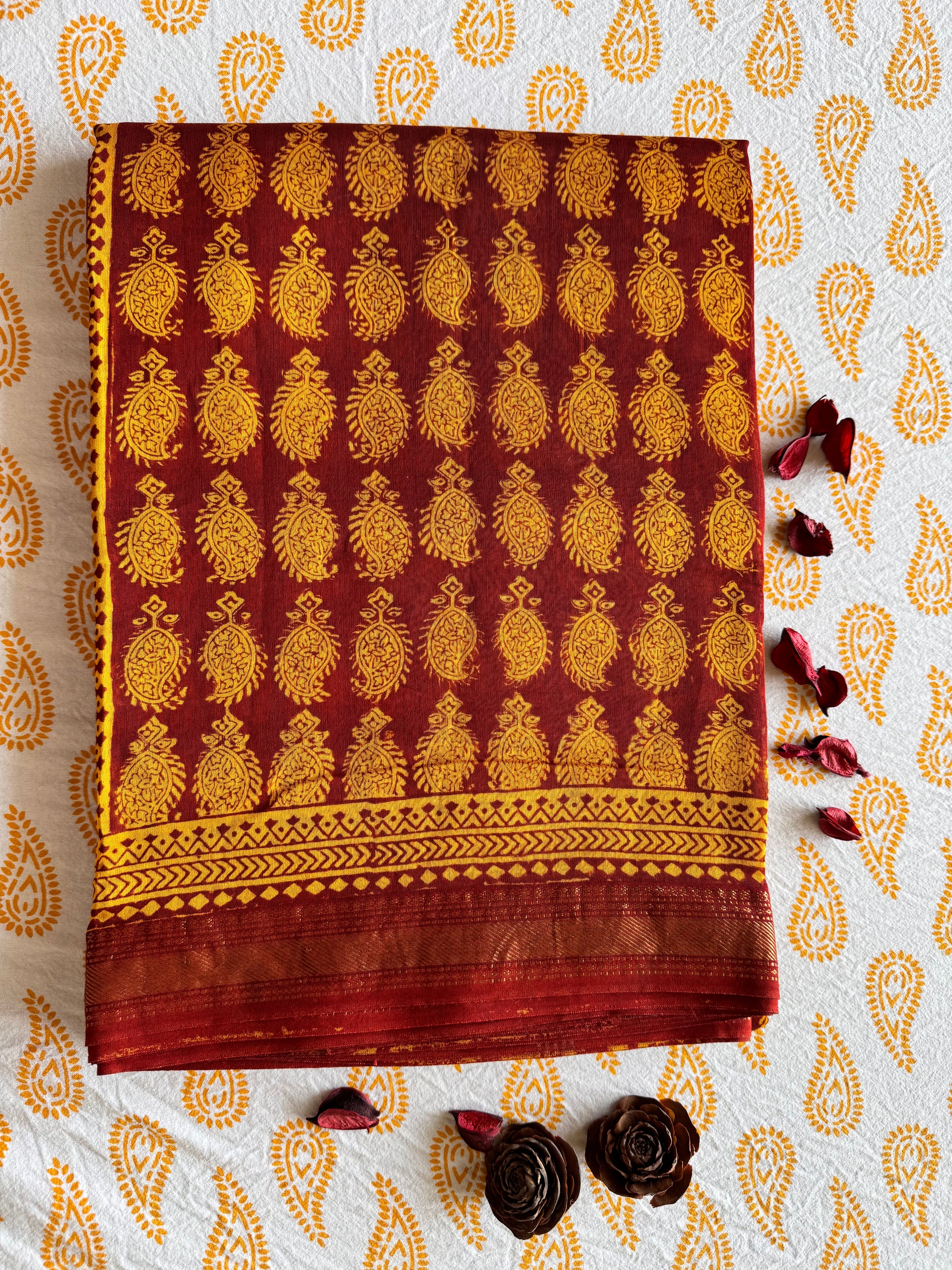 Handcrafted by our artisans in the historic town of Maheshwar, these exquisite Maheshwari sarees feature traditional Bagh handblock prints. They are dyed with natural colors derived from fruits, flowers, and spices like pomegranate peels, turmeric, etc.